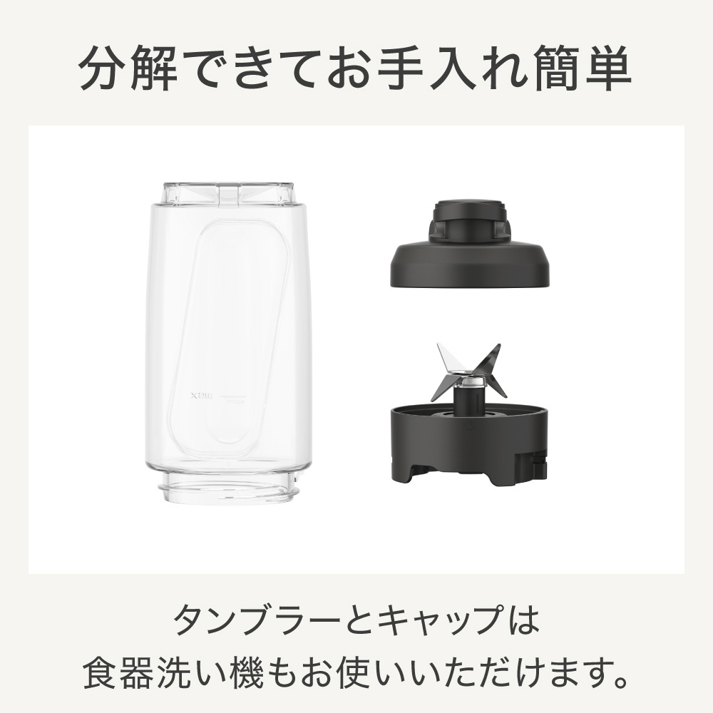 本体とタンブラー、ブレードは分解でき、細かい部分のお手入れも簡単。衛生面も安心です。また、コンパクトなパーソナルサイズなので、キッチンでも収納に場所を取りません。