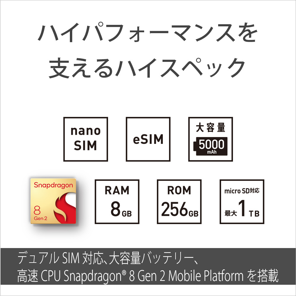 | 仕様1 | OS:Android? 13、CPU:SnapdragonR 8 Gen 2 Mobile Platform、内蔵メモリ (RAM/ROM):8 GB / 256 GB |