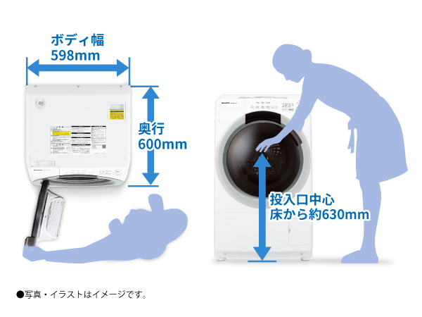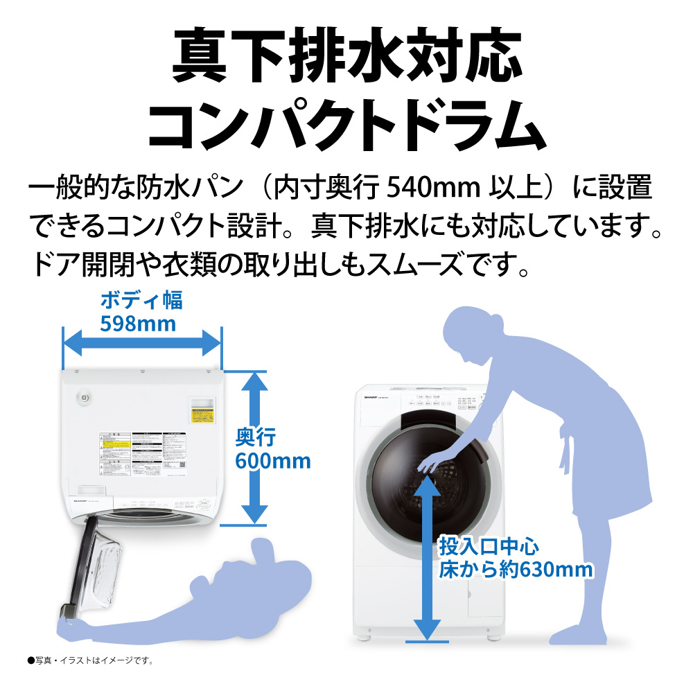 一般的な防水パン(内寸奥行540mm以上)に設置できるコンパクト設計だから、マンションへの設置にもぴったり。真下排水にも対応しています。ドア開閉や衣類の取出しもスムーズです。