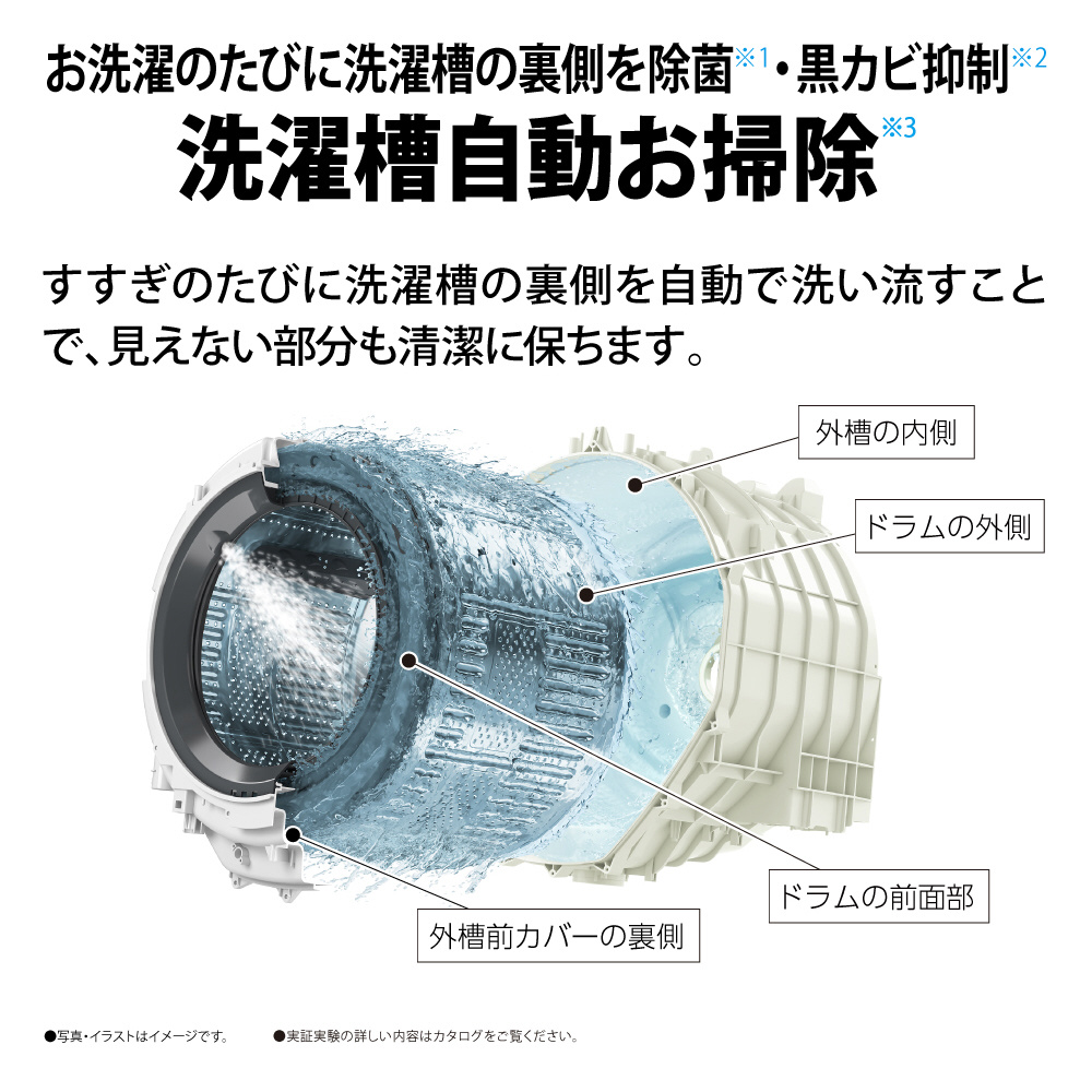※1 試験機関:(株)総合水研究所 試験方法:外槽に菌を付着させた試験布を取り付けて洗濯運転させて測定 除菌方法:標準コース(洗濯運転2.5s)による 対象部分:外槽(水槽前、水槽後ろ、ドラム、バランサー) 試験結果:99%以上抑制 試験機種:ES-S7H(2022年度、ES-S7Jと同等)。 ※2 試験機関:(株)総合水研究所 試験方法:外槽に黒カビを付着させた試験布を取り付けて洗濯運転させて測定 抑制方法:標準コース(洗濯運転2.5s)による 対象部分:外槽(水槽前、水槽後ろ、ドラム、バランサー) 試験結果:99%以上抑制 試験機種:ES-S7H(2022年度、ES-S7Jと同等)