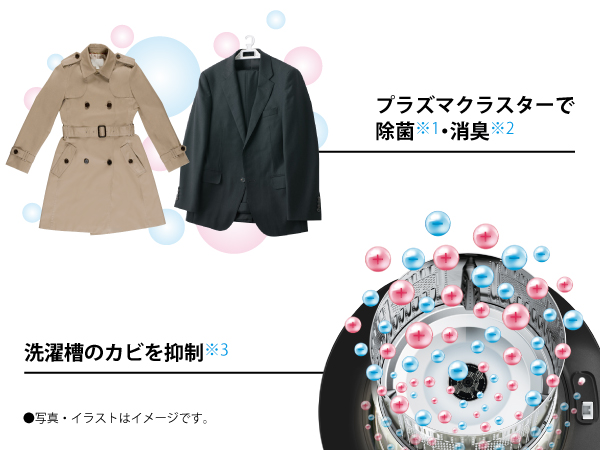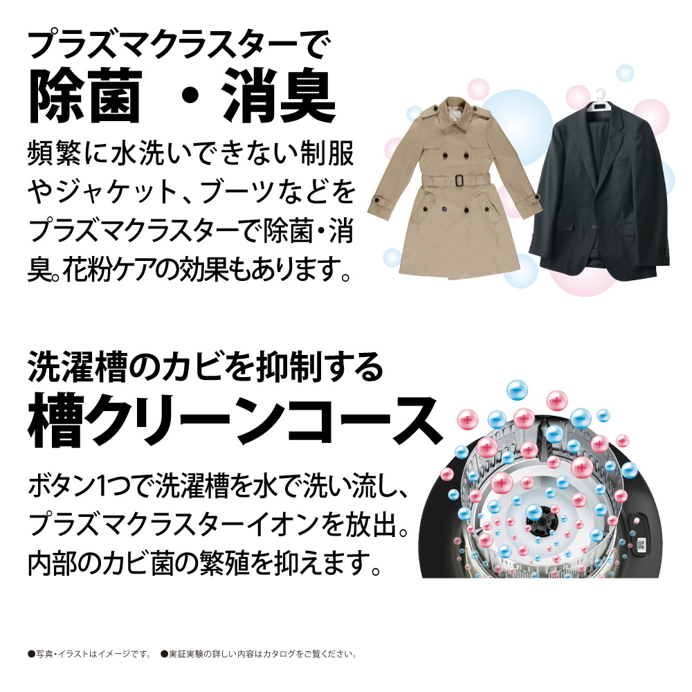 「プラズマクラスター除菌・消臭コース」なら、頻繁に水洗いできない制服やジャケット、ブーツなどをブラズマクラスターで除菌※1・消臭※2。花粉ケアの効果もあります。 また、ボタン1つで洗濯槽を水で洗い流し、プラズマクラスターイオンを放出する「槽クリーンコース」を搭載。内部のカビ菌の繁殖を抑えます※3。x