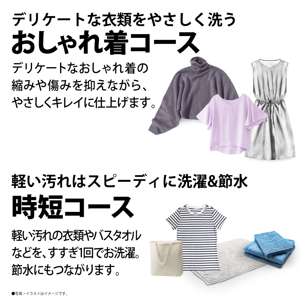 「おしゃれ着コース」を使えば、デリケートなおしゃれ着の縮みや傷みを抑えながら、やさしくキレイに仕上げます。 また、「時短コース」を使えば、軽い汚れの衣類やバスタオルなどをすすぎ1回でお洗濯。節水にもつながります。
