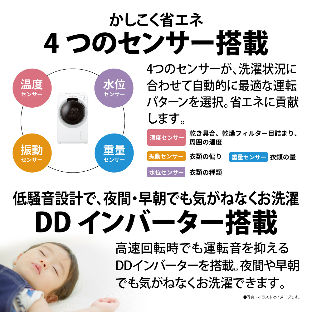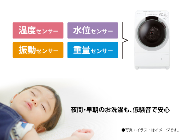 4つのセンサーが、洗濯状況に合わせて自動的に最適な運転パターンを洗濯。省エネに貢献します。 また、高速回転時でも運転音を抑えるDDインバーターを搭載。夜間早朝でも気兼ねなくお洗濯できます。