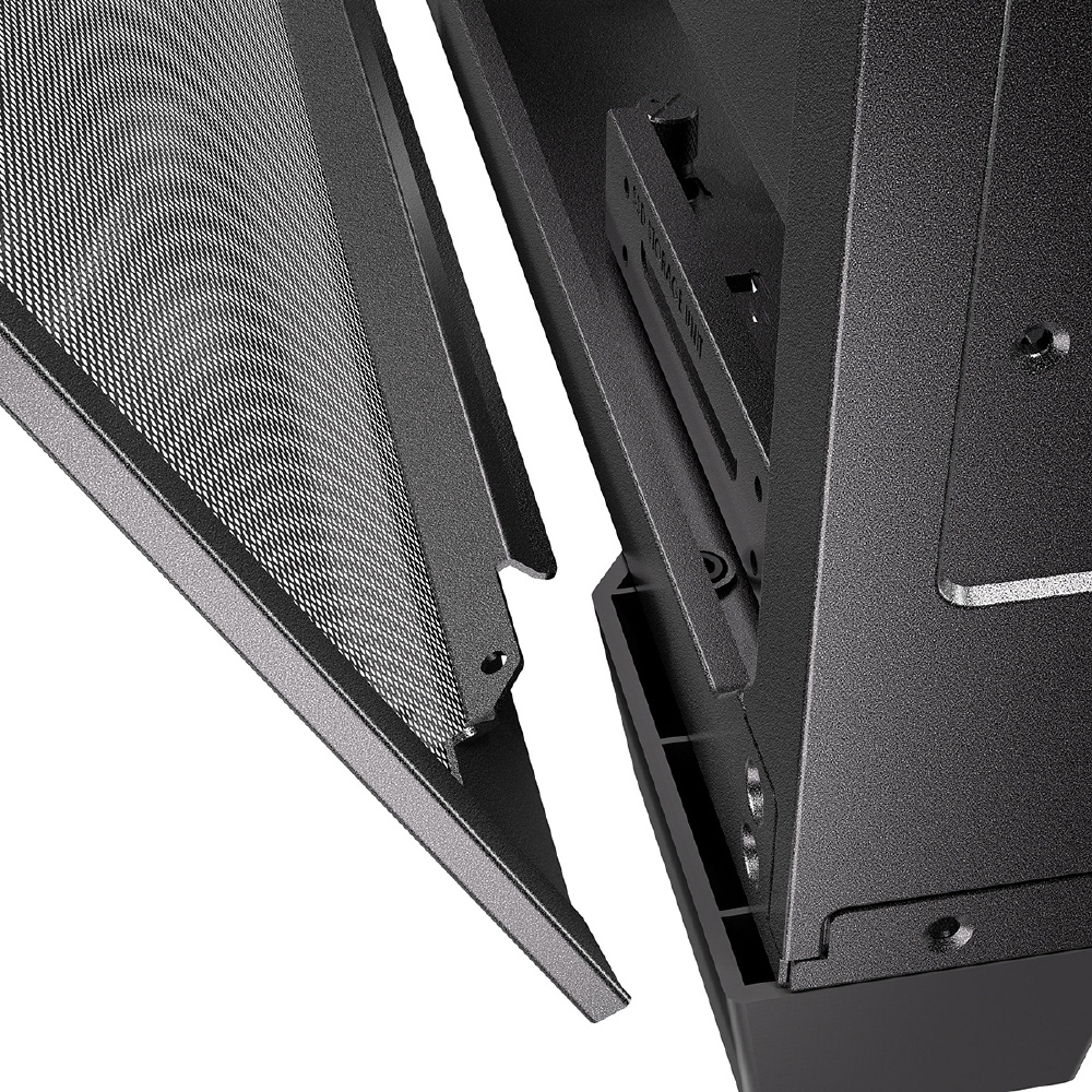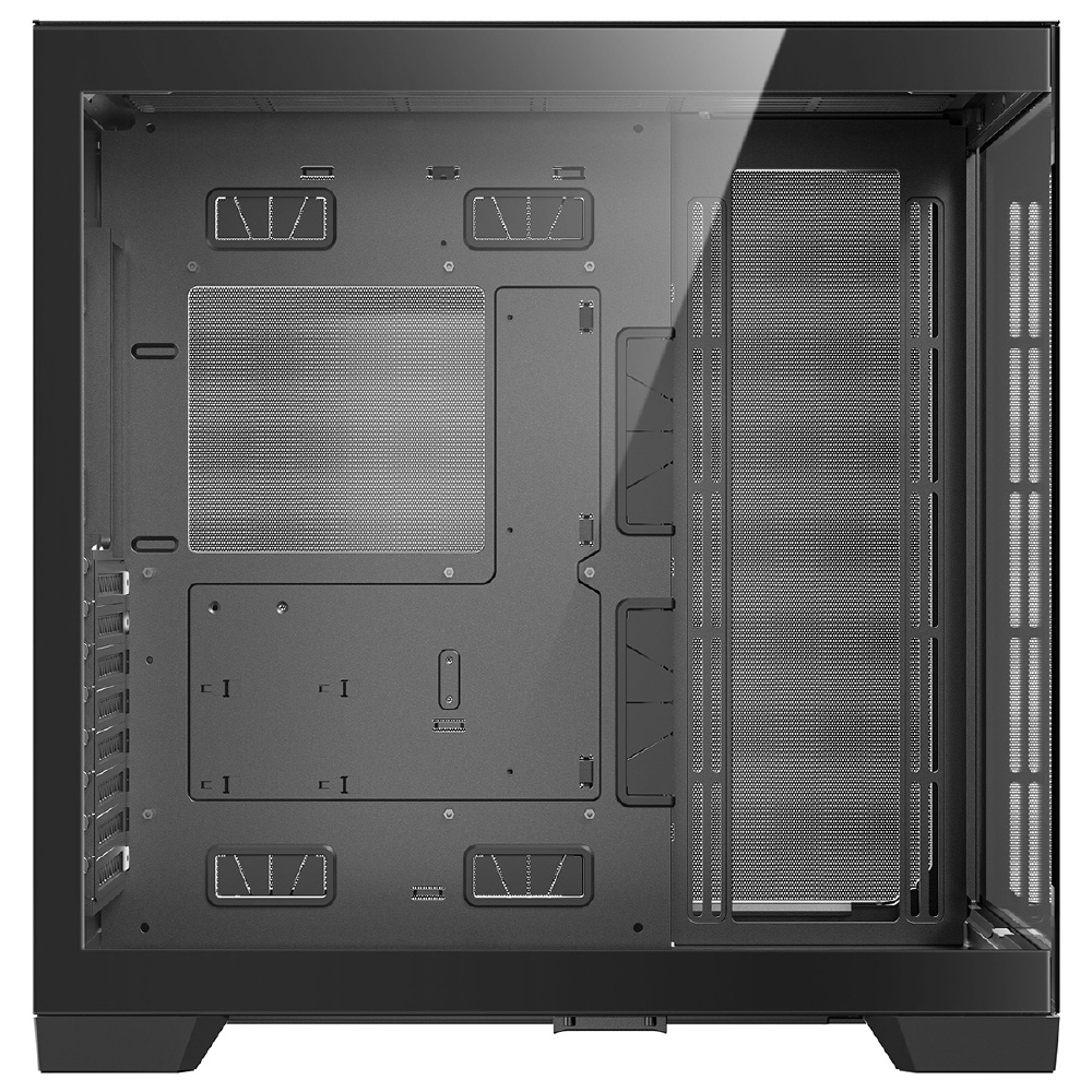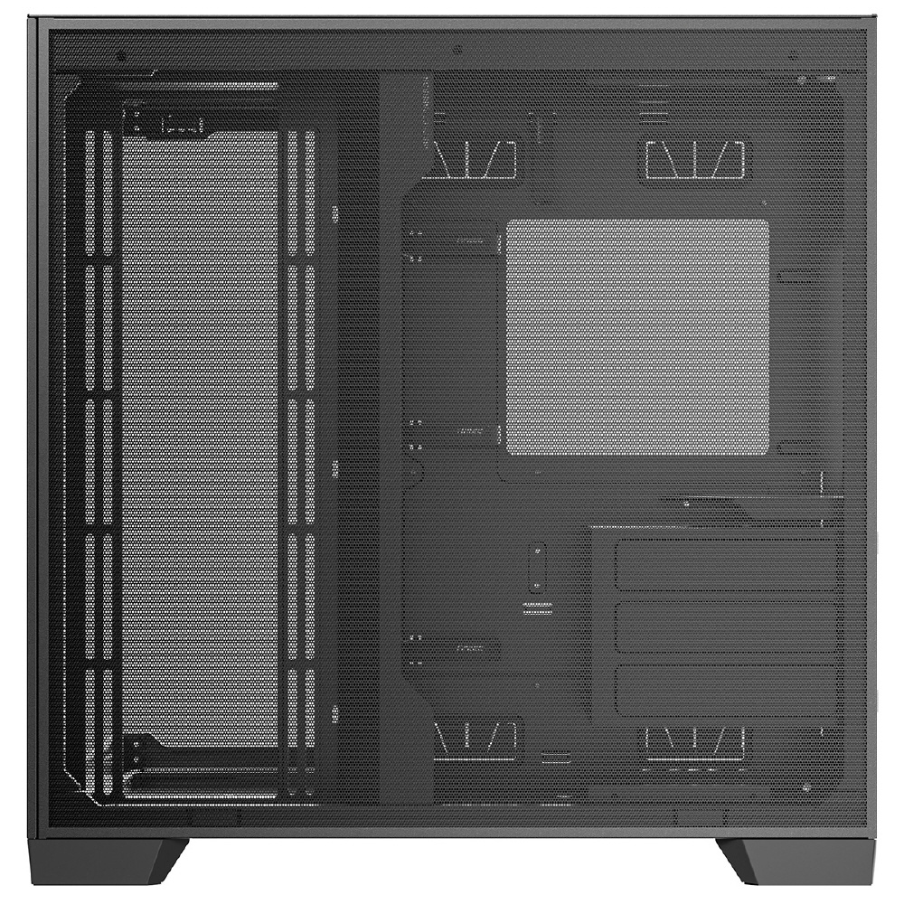 C8は、フロントとサイドに強化ガラスパネルを搭載し、右側はメッシュのスチールパネルを搭載したE-ATXマザーボード対応のフルタワーPCケースです。最大120 mmファンを10基搭載することができ、左側の強化ガラスパネルは表面にネジ穴を設けないことで美観と耐久性を両立します。