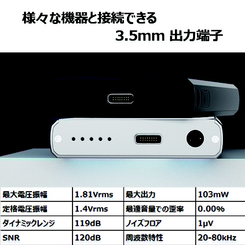 様々なイヤホンに対応するスタンダード規格。最大電圧振幅:1.81Vrms 最大出力:103mW、定格電圧振幅:1.4Vrms、最適音量での歪率:0.001%、ダイナミックレンジ:119dB、ノイズフロア:1μV、SNR:120dB、周波数特性:20-80kHz
