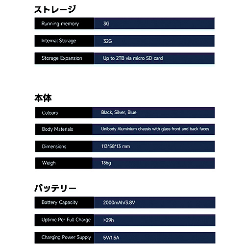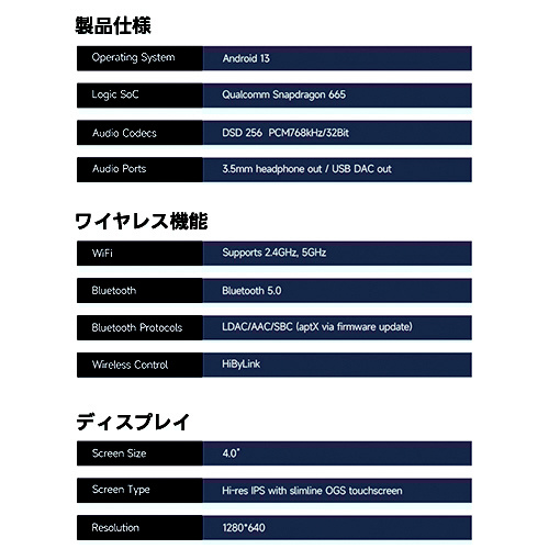 | 仕様2 | ●WiFi audio:HiByLink●ディスプレイ:4.0 インチ タッチスクリーン●ディスプレイタイプ:IPS●ディスプレイ解像度:1280×640●RAM:3GB●内部ストレージ:32GB●マイクロSD:2TB●筐体素材:アルミニウム筐体にガラス製のフロント、バックプレート |