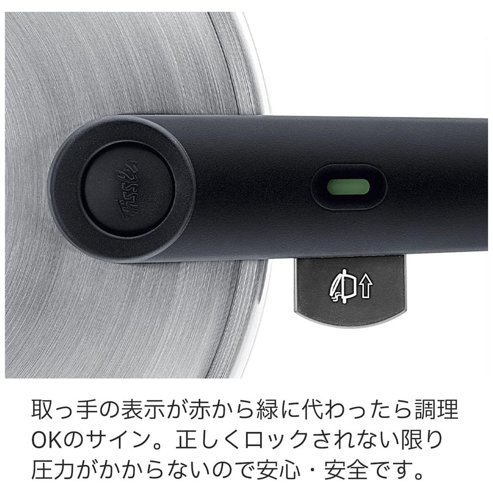 取っ手の表示が赤から緑に代わったら、フタがきちんとしまり、調理OKのサイン。