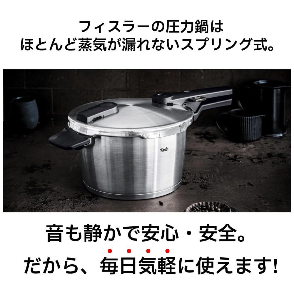 蒸気が少なく音も静かなフィスラーの圧力鍋 ビタクイック プレミアムと、健康的な料理が時短で簡単に、しかも安心・安全、そして省エネの圧力調理の世界へ。