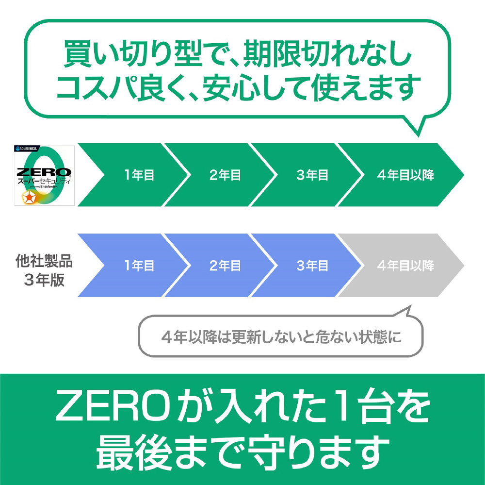 防御力No.1のウイルス対策ソフト。しかもZEROは更新料0円。1台に1度入れたら、その端末が使える限り、期限切れにならずに使えます。軽いので快適。Windows、Mac、iOS、Androidに対応。