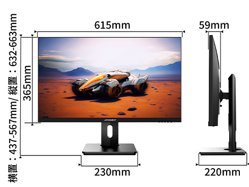 本体サイズ 高さ:横置き 437〜567mm 縦置き 632〜663mmx幅:615mmx奥行220mm スタンド幅230mm(スタンド付)