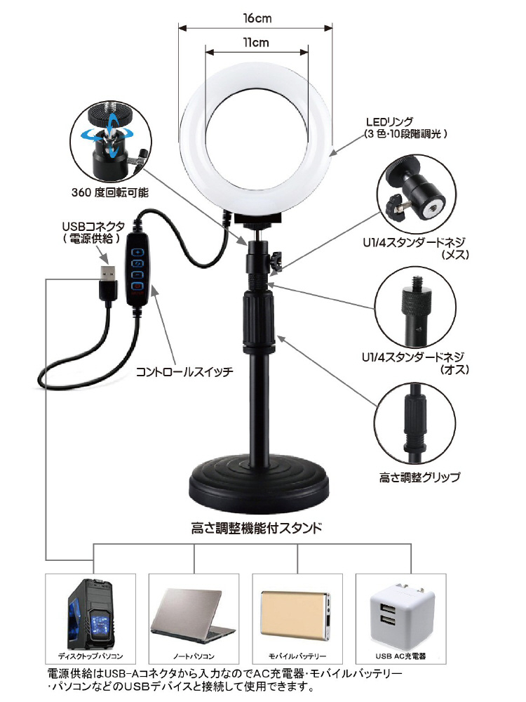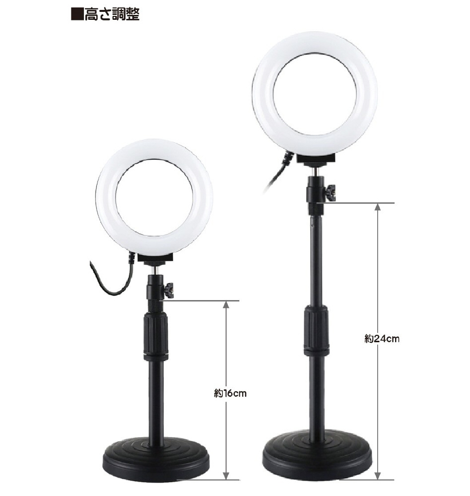 | 商品名 | 撮影照明器具LEDリングライト 外径16cmx内径11cm/スタンド付き ブラック |