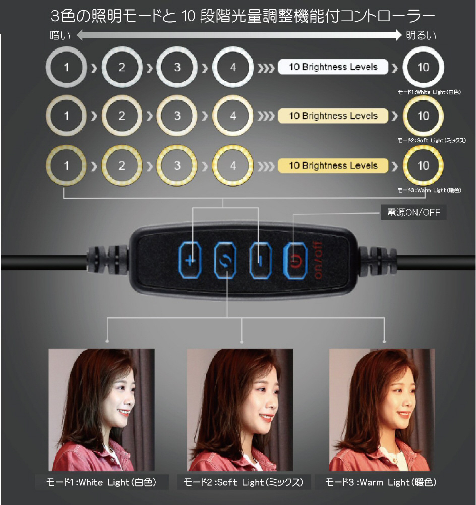 調光は10段階の明るさ調整ができます。シーンに合わせて適切な照明で良い写真やビデオを撮影できます。
