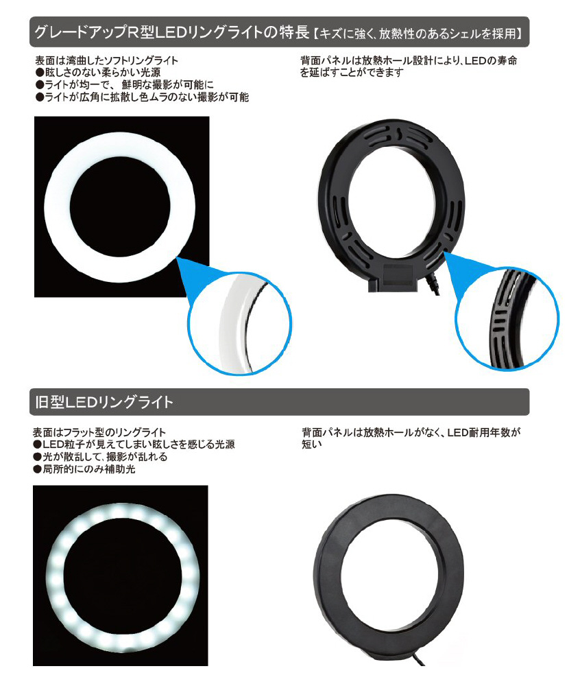 | 仕様3 | 商品内容:LEDリングライト 1・三脚取り付け金具 1・高低調整スタンド 1 |
