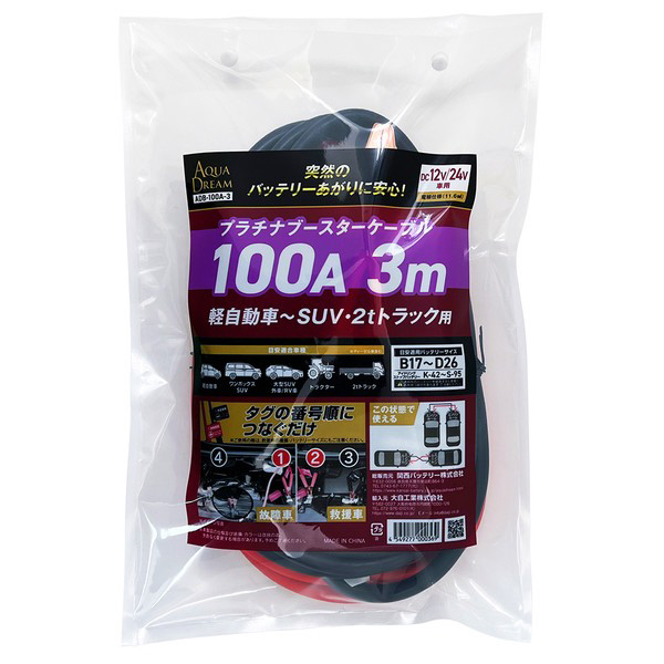 プラチナブースターケーブル 100A 長さ:3m 使用目安:軽自動車〜SUV・2tトラック用 DC12V/24V車用 ADB-100A-3