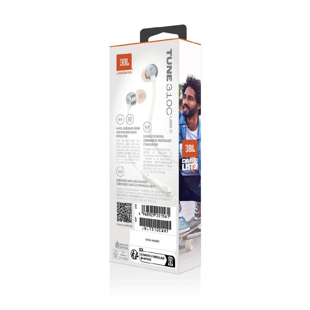 96kHz/24bitのDAC内蔵、アプリなしで選べるプリセットEQ搭載。USB Type-C接続で幅広いデバイスで高音質を体感できる。インイヤーイヤホン「JBL TUNE310C」