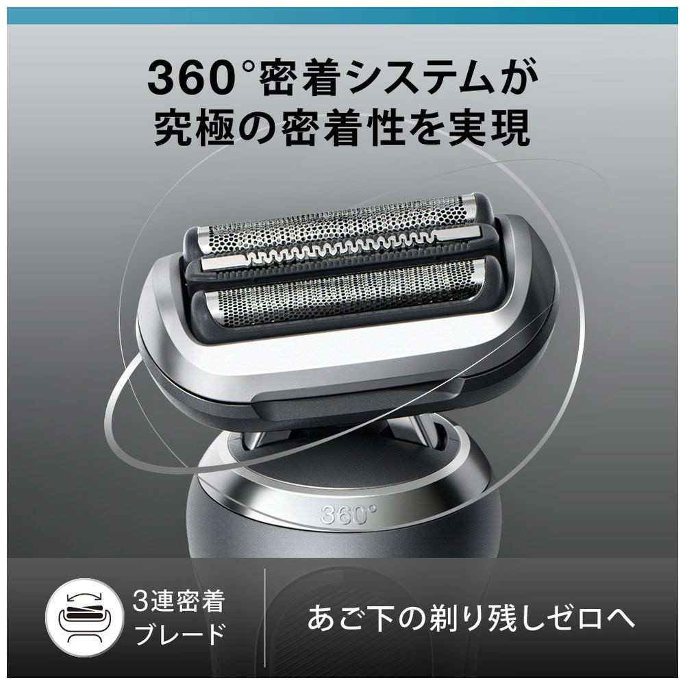 シリーズ7は360°密着システムを搭載。3つの刃の浮き沈み、前後の首振りに横の動きも加わった究極の密着性を実現。全方位への動きが可能となり、密着が難しく、剃り残しが気になるあご下や鼻下でも密着します。あご下の剃り残しゼロへ