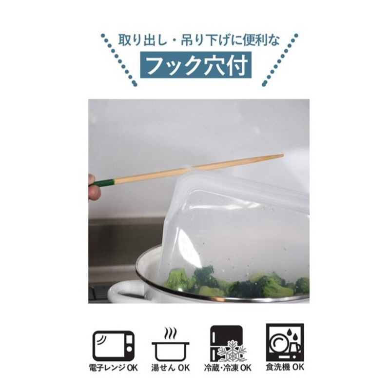 繰り返し使える!シリコーン製保存バッグ。シリコーンバッグに入れて食材や料理の冷蔵・冷凍保存ができます。立てて収納できるので、冷蔵庫の中もすっきりです。電子レンジ対応なので中の食材を温めたり、湯せんして加熱することも可能です。食器洗い乾燥機対応なので、繰り返し洗って使えます。取り出し・吊り下げに便利なフック穴付きです。ご注意: 火のそばに置かないでください。