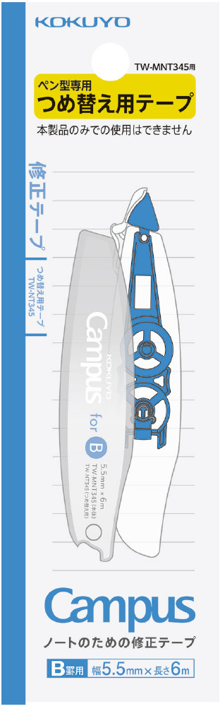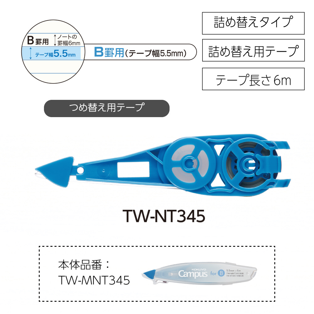| 商品名 | 修正テープペン型つめ替え用テープ [B罫用/テープ幅 : 5.5mm/長さ : 6m] Campus(キャンパス) 青 TW-NT345 |