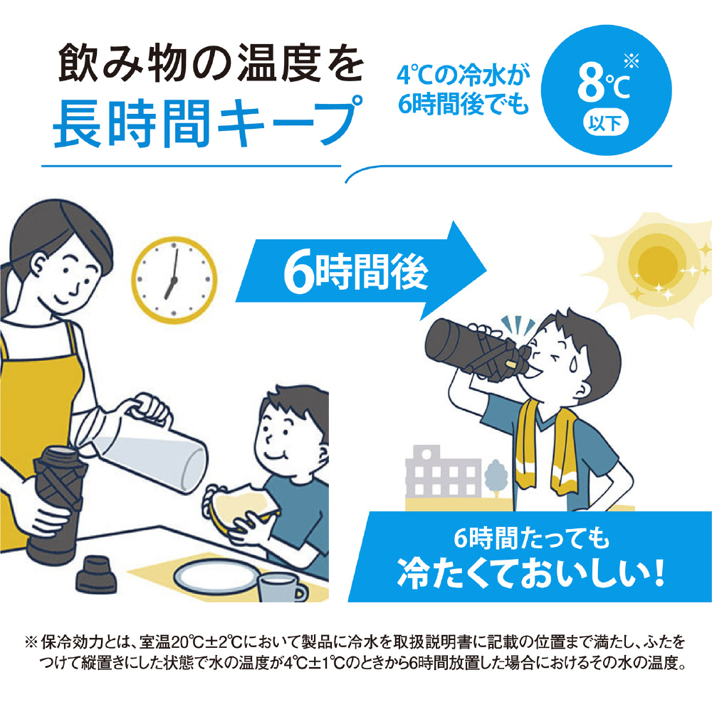 | 保冷効力 | 4℃の冷水が6時間後でも8℃以下 |