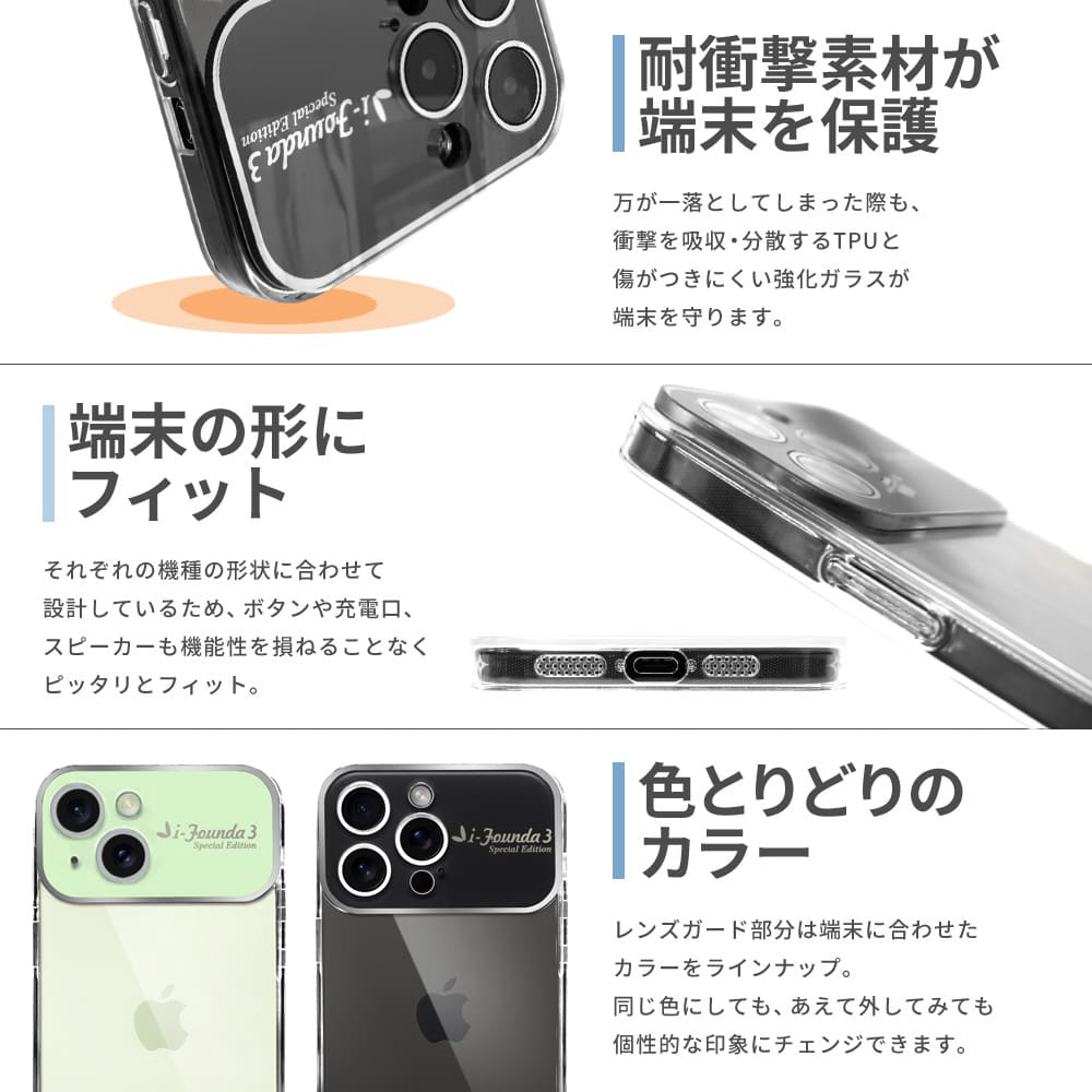 本体カラーに合わせてカメラ部を装飾!衝撃を吸収・分散するTPU、背面に強化ガラスを使用したクリアケース