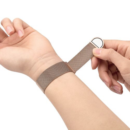 工具なしで長さ調節が簡単にできる、マグネットバックルを採用。通気性がよく手首へのフィット感が高い編み込み構造で、スタイリッシュなデザインのApple Watch用ステンレスバンドです。