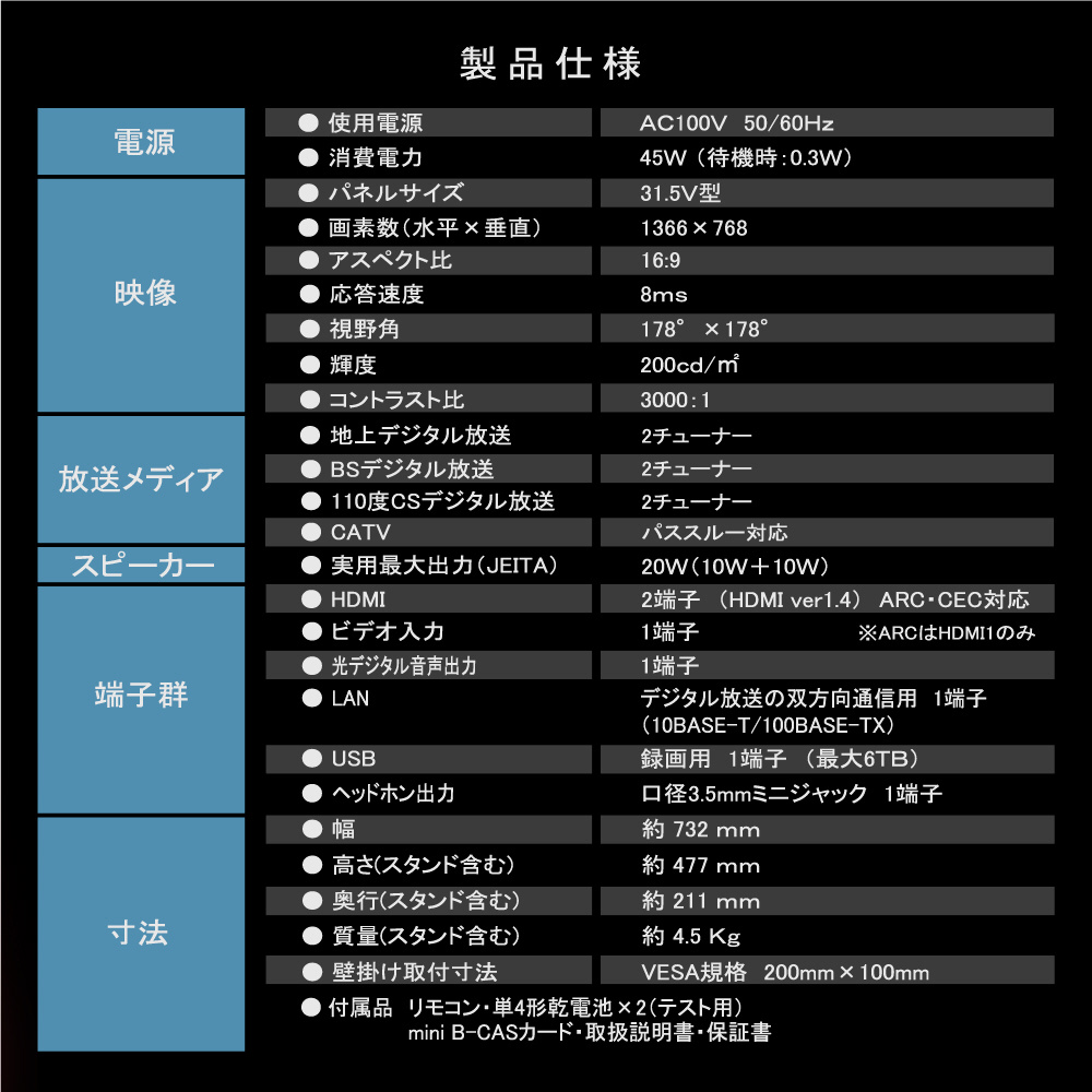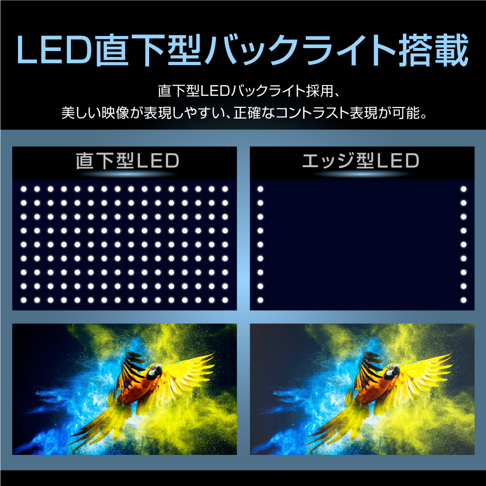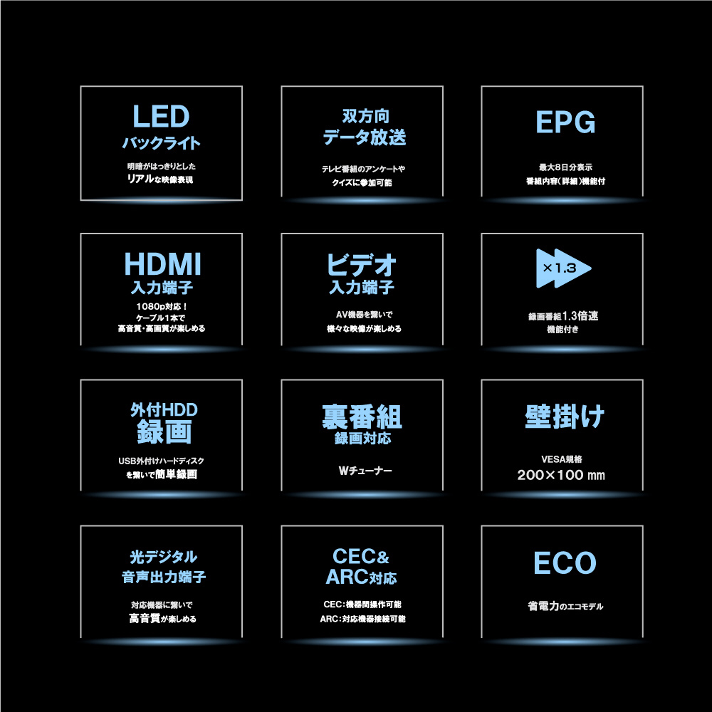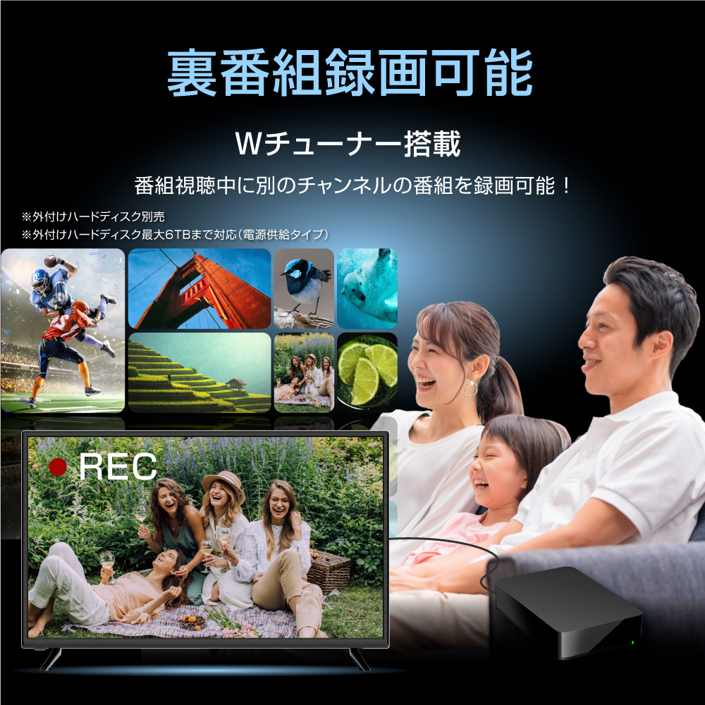 A級パネル採用し、日本設計ボードの映像エンジン ソシオネクスト製チップを使用したハイビジョン液晶テレビです。LED直下型バックライト採用で、正確なコントラスト表現が可能となり、美しい映像をご覧いただけます。ダブルチューナー搭載なので裏番組録画が可能です。一人暮らしのワンルームやプライベートルームにぴったりのミドルサイズテレビです。
