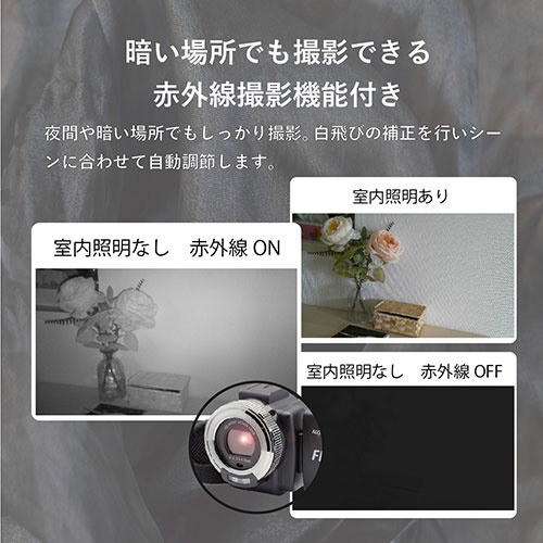 ●赤外線付きで夜間でも暗い場所でも撮影可能。