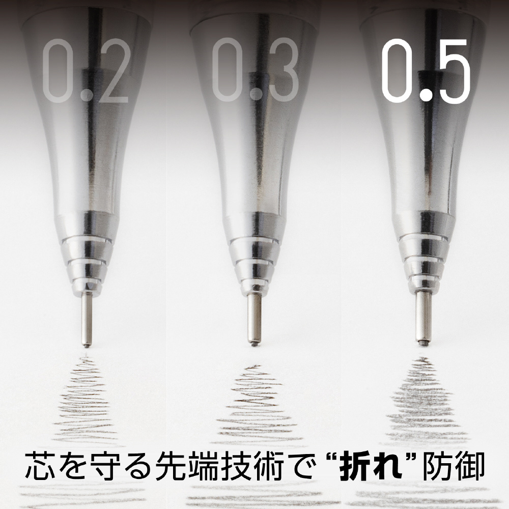 最大の特長は、ペン先から芯を出さずに書けることです。ペン先のパイプが芯の減りに合わせて一緒にスライドすることで、芯が常にパイプで守られた状態で筆記ができるため、芯が折れません。