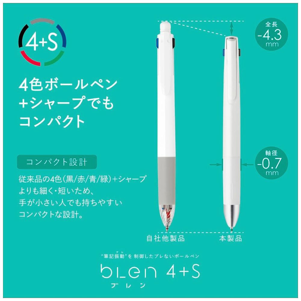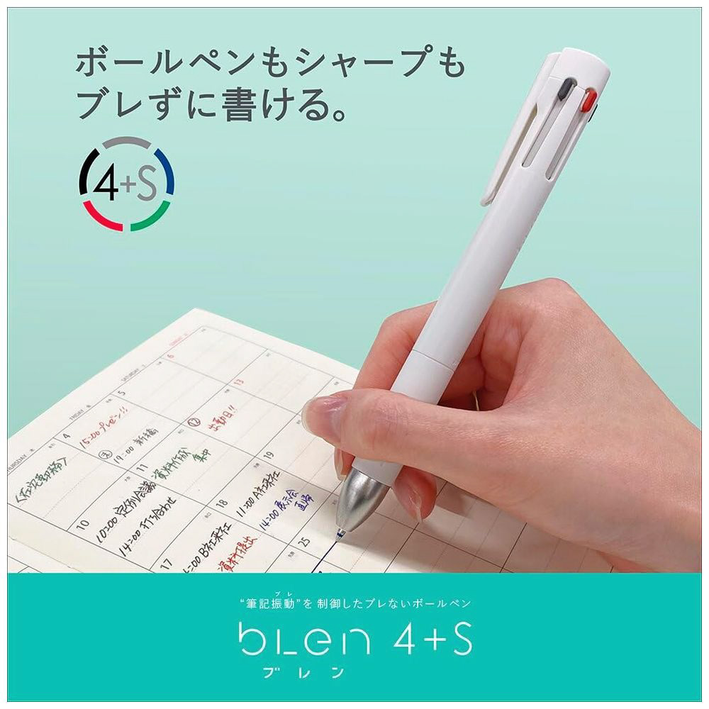 ブレン4+Sは、4色ボールペン+シャープペンが1本にまとまった5機能タイプです。仕事や趣味や家庭や推し活など、生活の中で複数のことを行い管理したい時に、それらを色分けして書き、この1本で完結することができます。