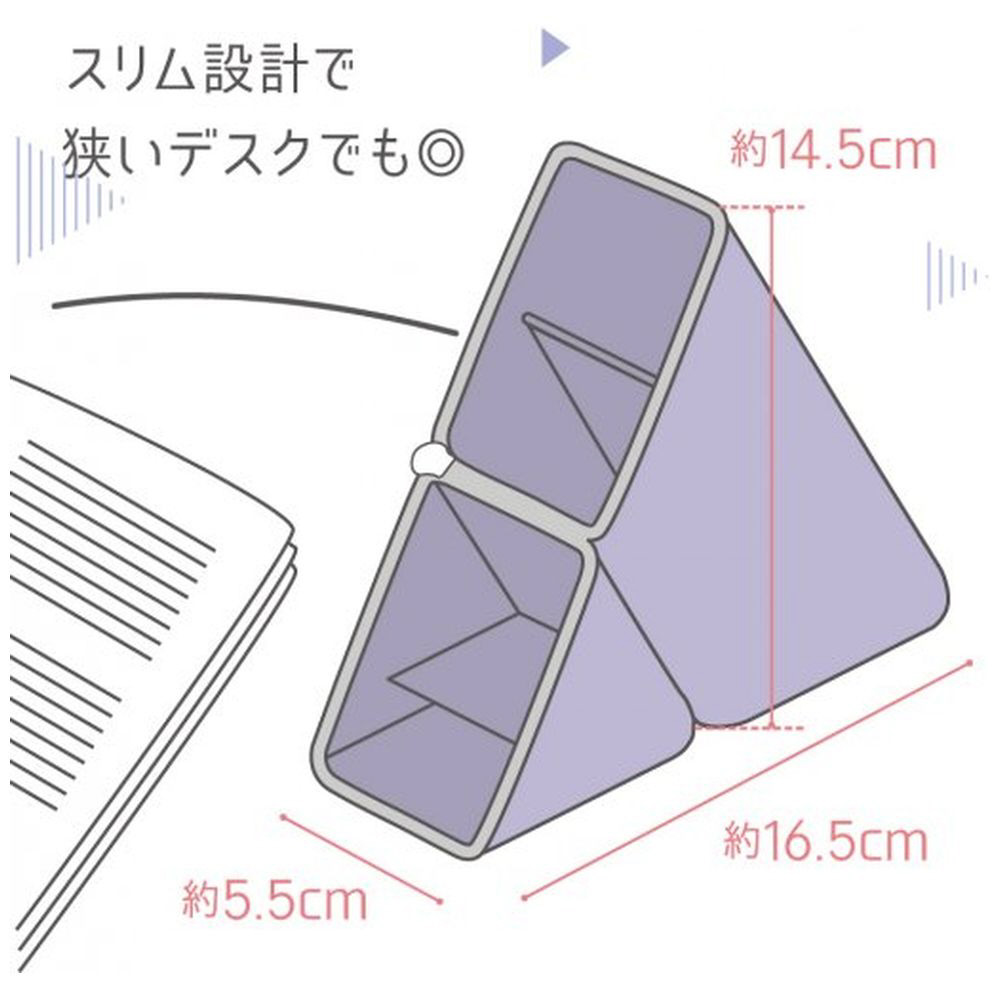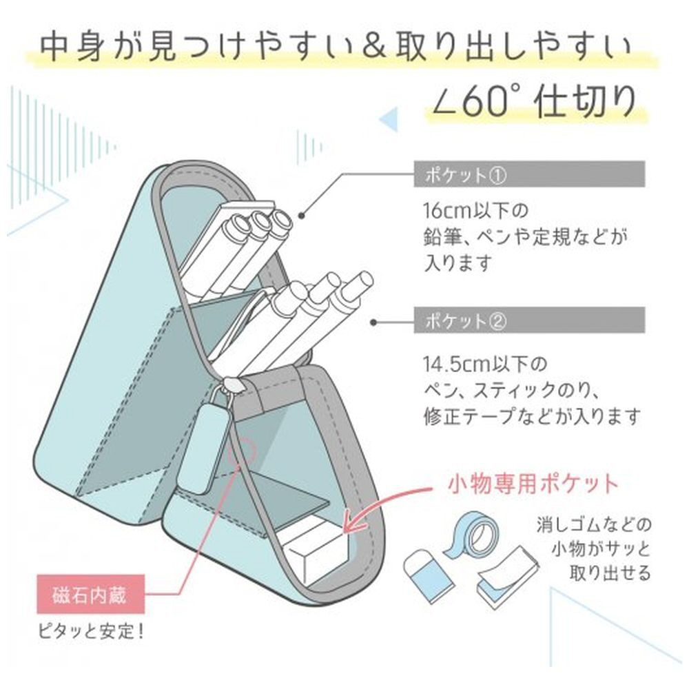 60度の仕切りでペンが埋もれないから見つけやすい&取り出しやすい。勉強や仕事の時間効率アップ。外出先へ持ち運んで使えるペン立て。磁石でピタッとくっついて、三角の形で安定してスタンド。小物専用ポケットには、消しゴム、ふせんなどの小物をわけて収納できる。柔らかいシリコン素材。表面は、汚れやホコリが付きにくい、さらさら加工。
