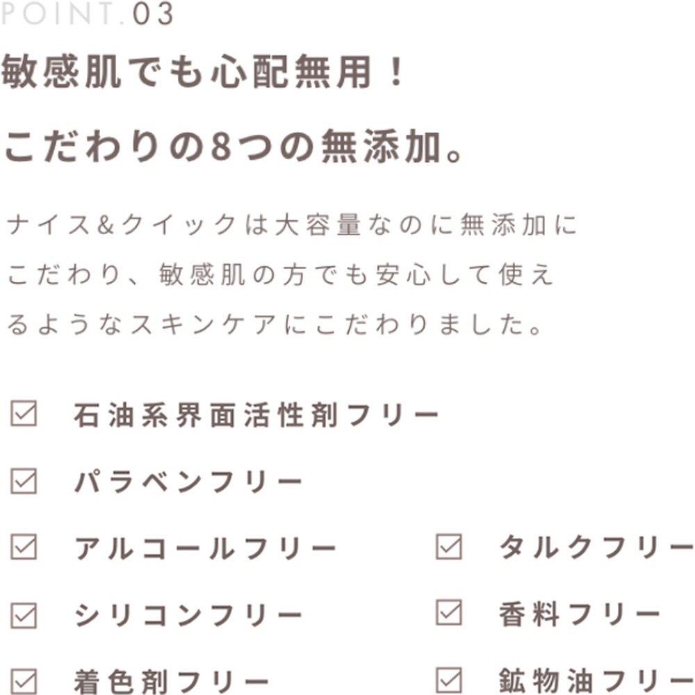 8つの無添加処方(パラベン、着色料、香料、石油系界面活性剤、アルコール、鉱物油、シリコン、タルクすべてフリー)。