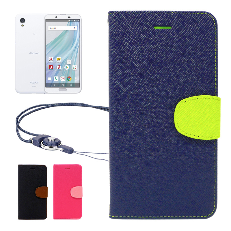 商品名 | AQUOS sense2 SH-01L SHV43 2WAYストラップ付 手帳型 ネイビー×ライトグリーン SHAQSE2BL |