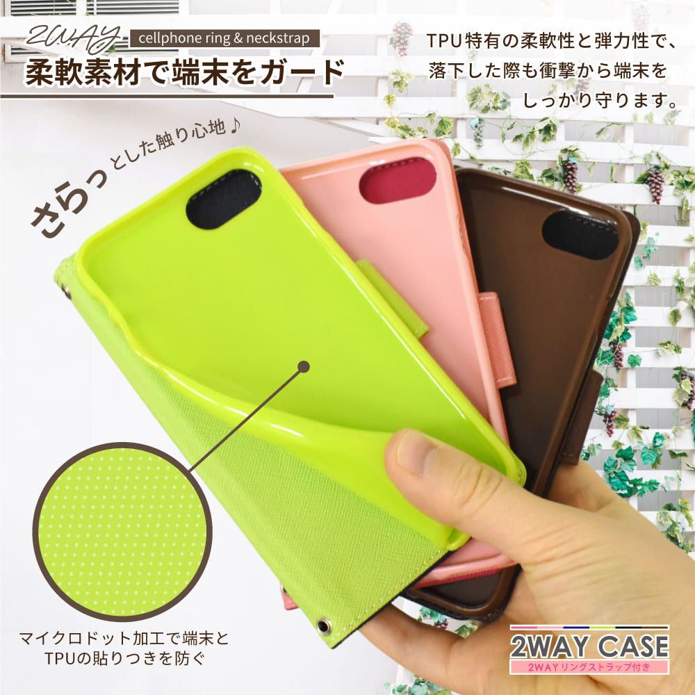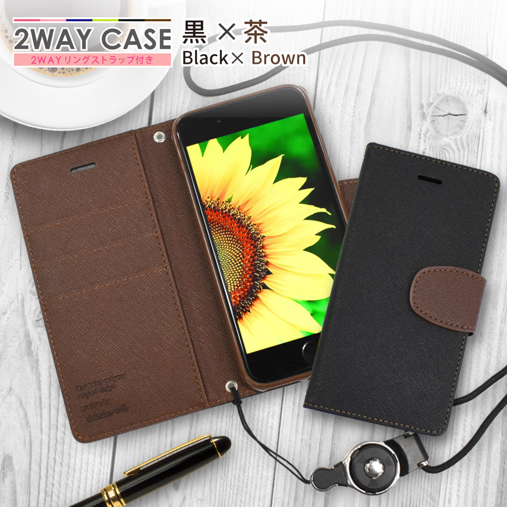 おしゃれカジュアルな バイカラー手帳型ケース2WAYワンタッチ着脱ロングストラップ付でネックorハンドどちらでもOK