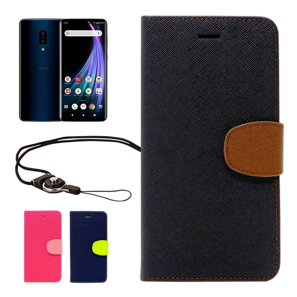 AQUOS zero2 SH-01M SHV47 2WAYストラップ付 手帳型 ブラック×ダークブラウン SHAQZ2BK