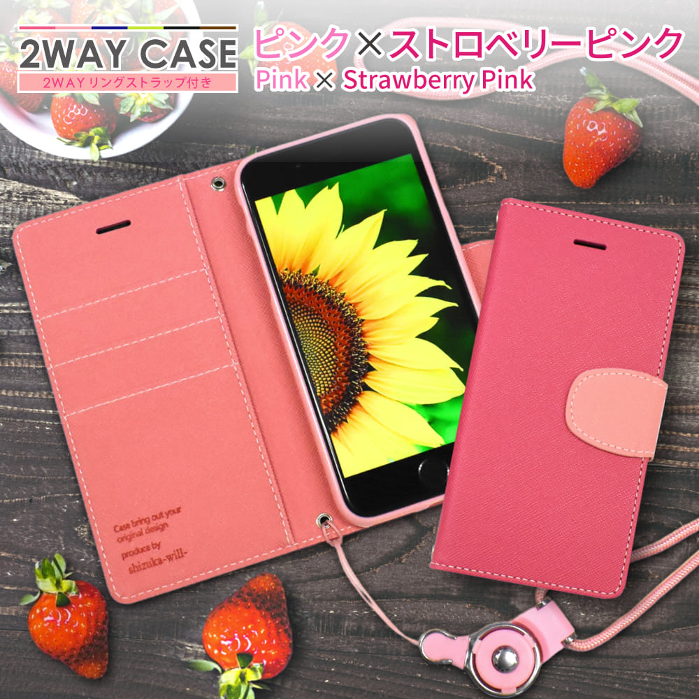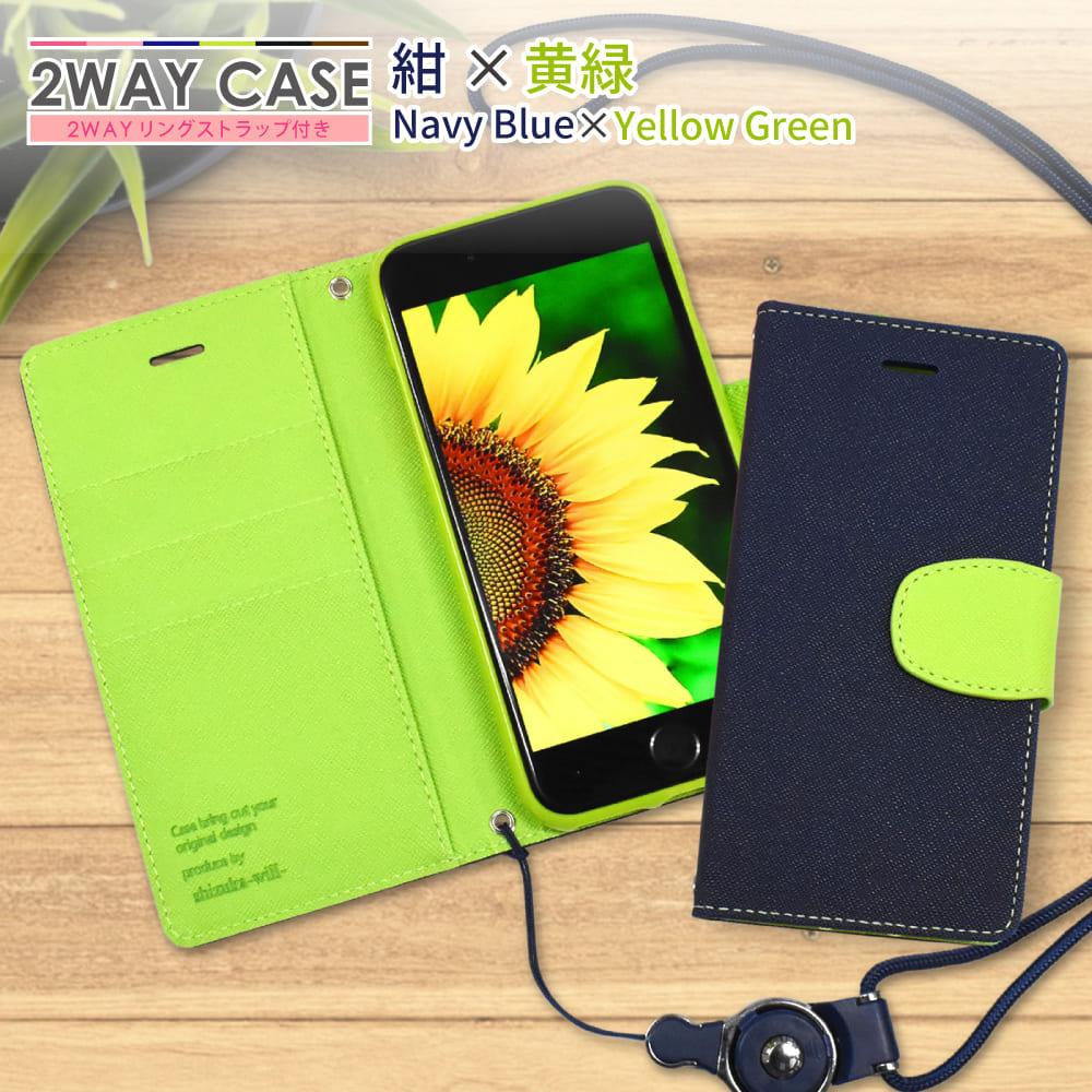 おしゃれカジュアルな バイカラー手帳型ケース2WAYワンタッチ着脱ロングストラップ付でネックorハンドどちらでもOK