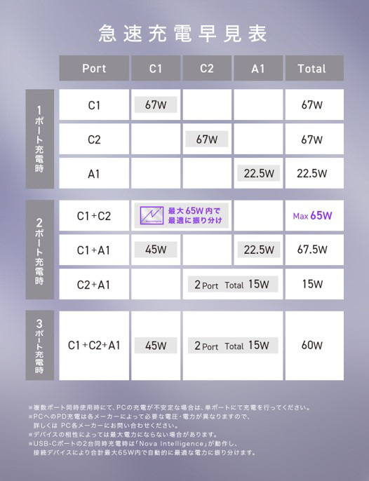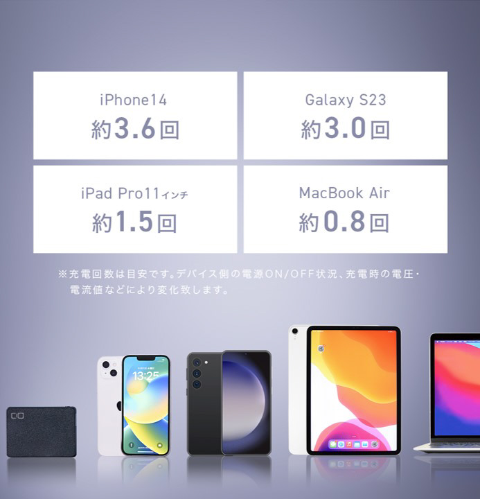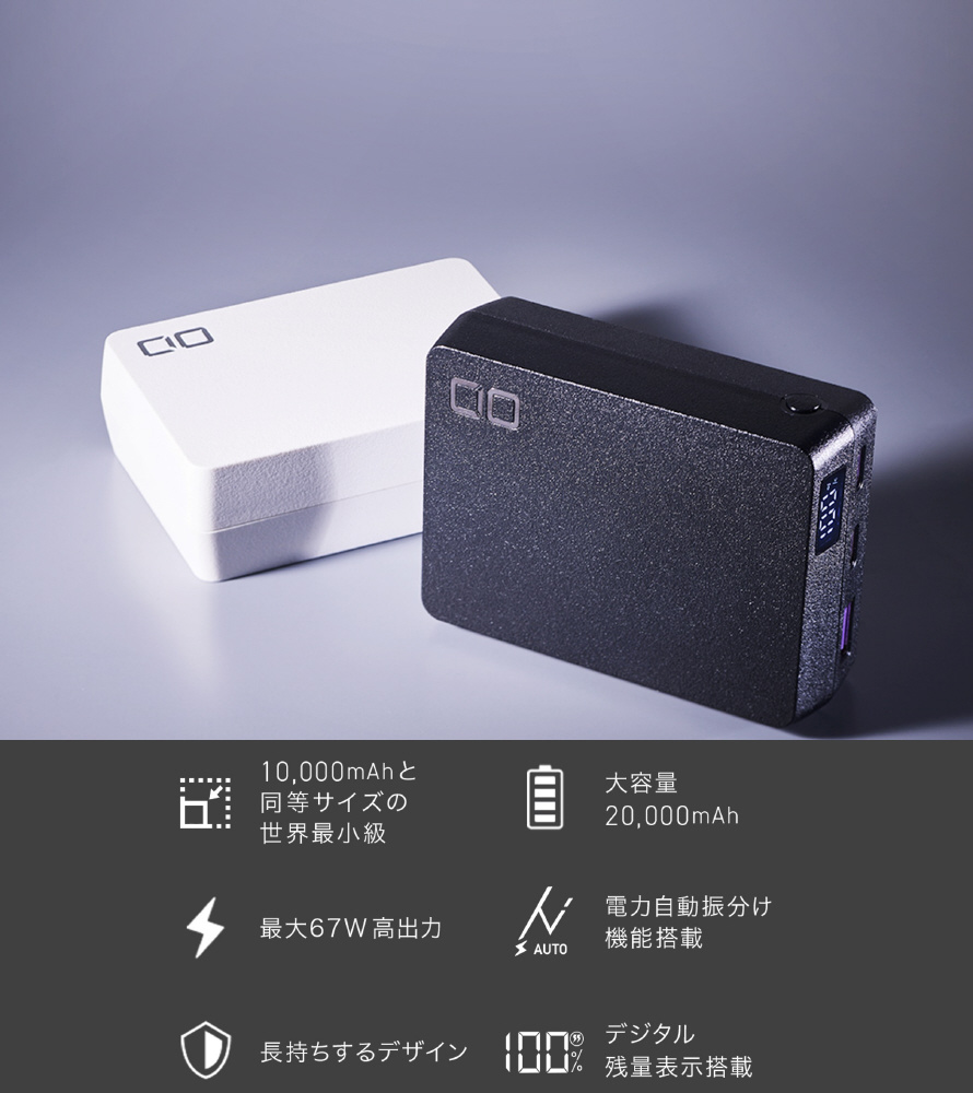 20,000mAhのモバイルバッテリーの中でも圧倒的な小ささと前モデルと比較し体積約26%減、重量約19%減の軽量化を実現。高出力なのでスマホやノートPCなど、あらゆるデバイスを充電可能。最大67W出力に対応。