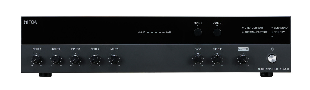 マイク入力4系統、予備入力1系統に加え、優先機能および2局ゾーンセレクターを内蔵したPAアンプです。