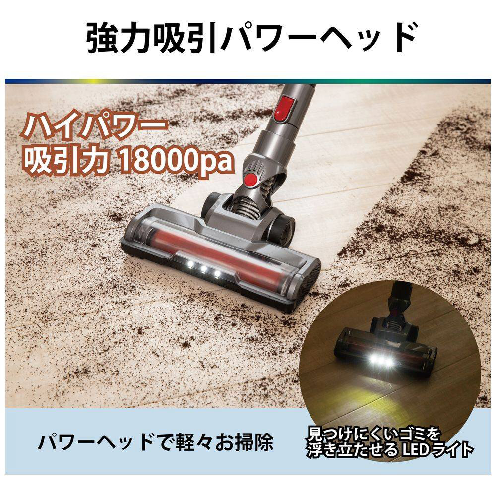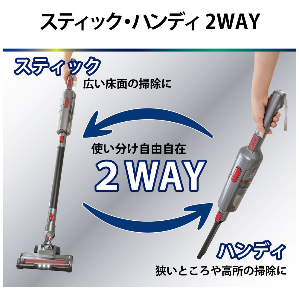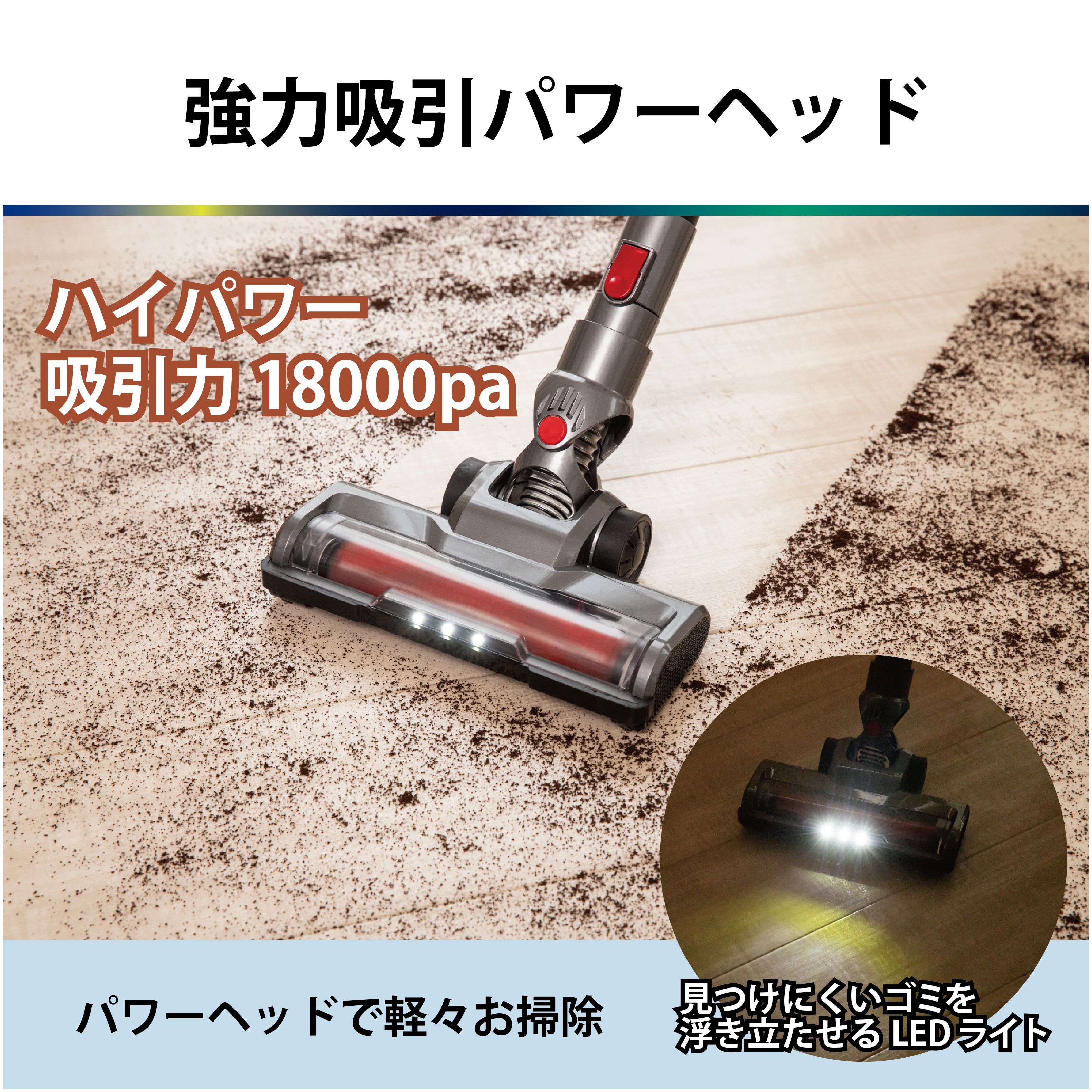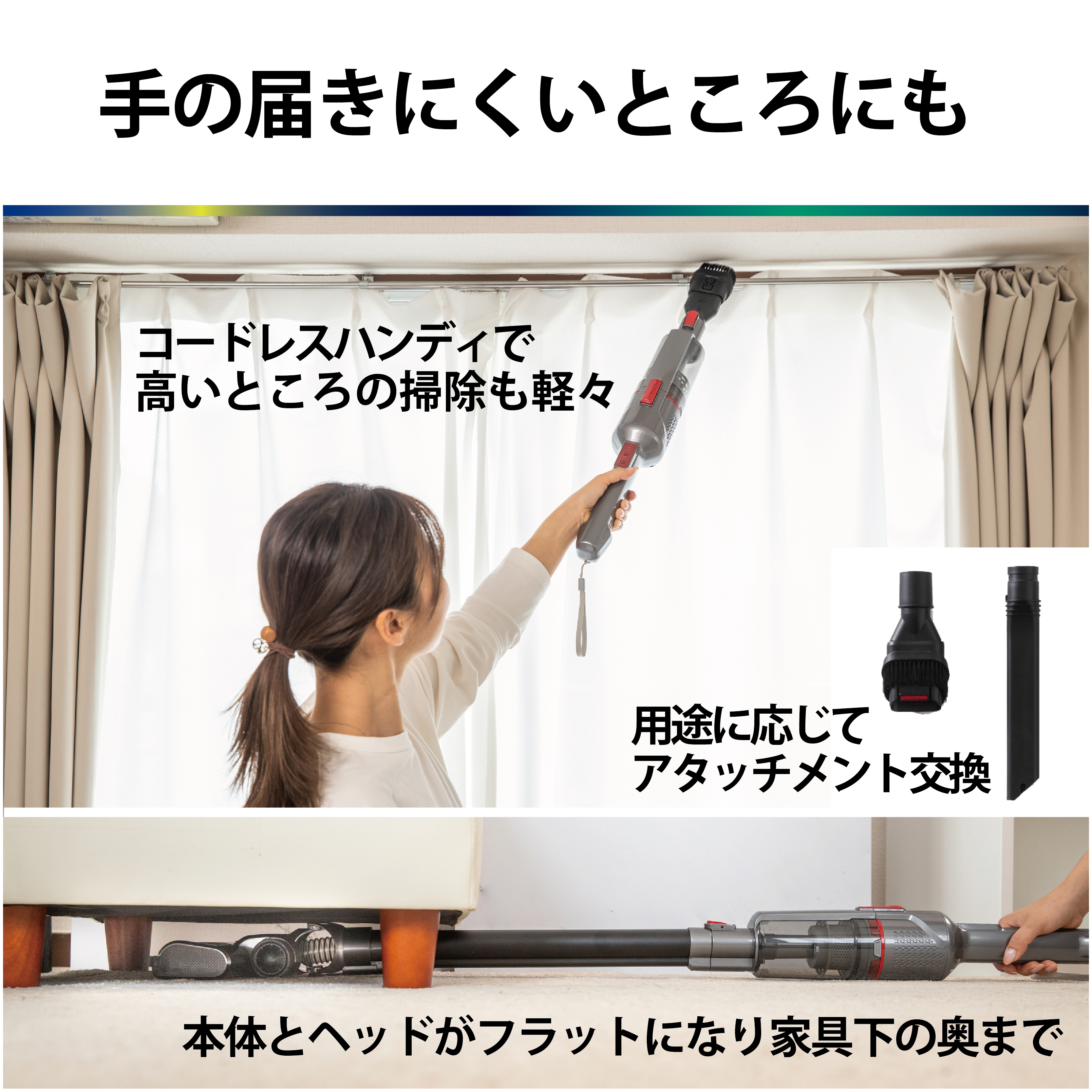 ・200W高効率ブラシレスモーターを使用、高い吸引力を実現 ・LEDライト付きパワーヘッド ・バッテリー残量 3段階表示 ・スティック&ハンディ―の2Way仕様