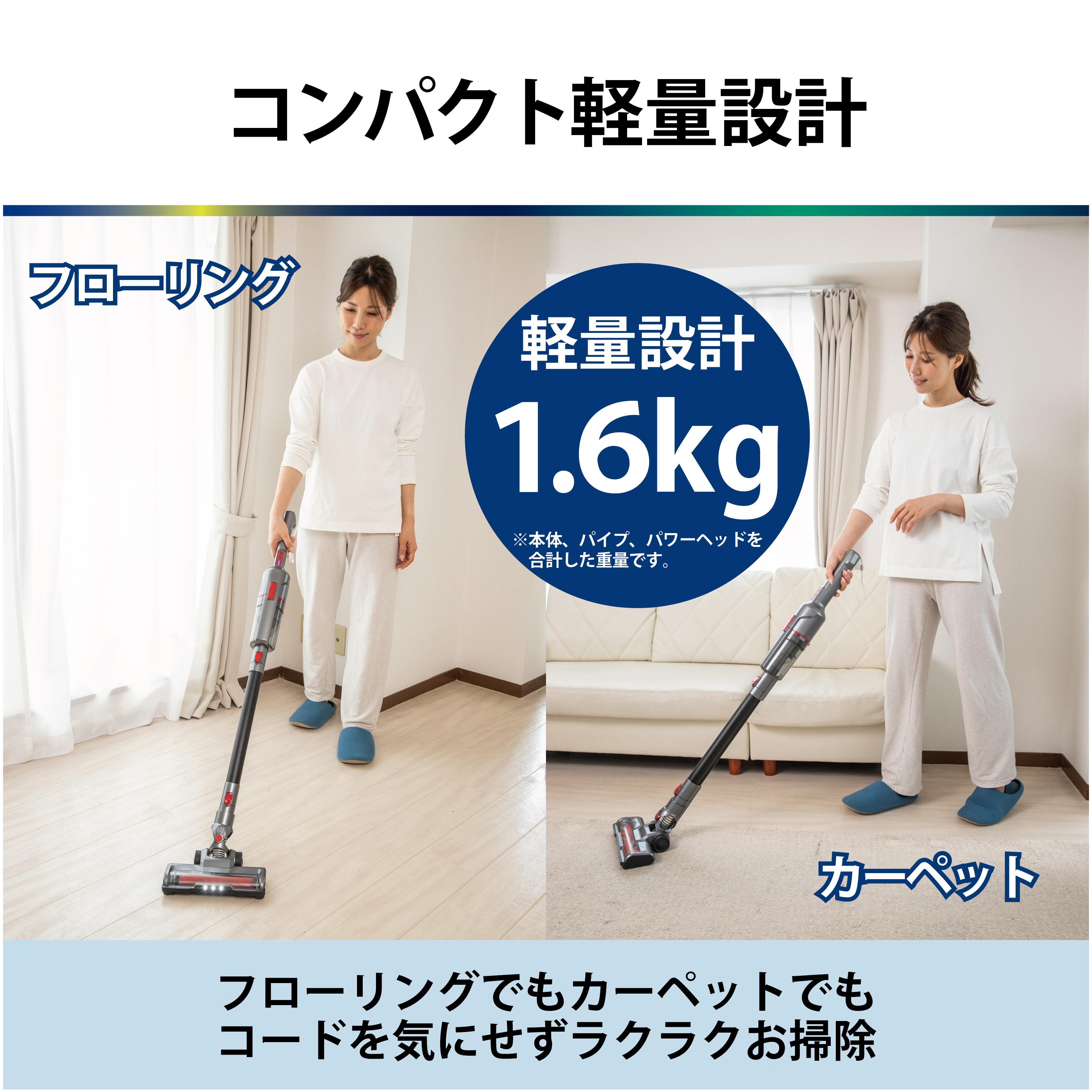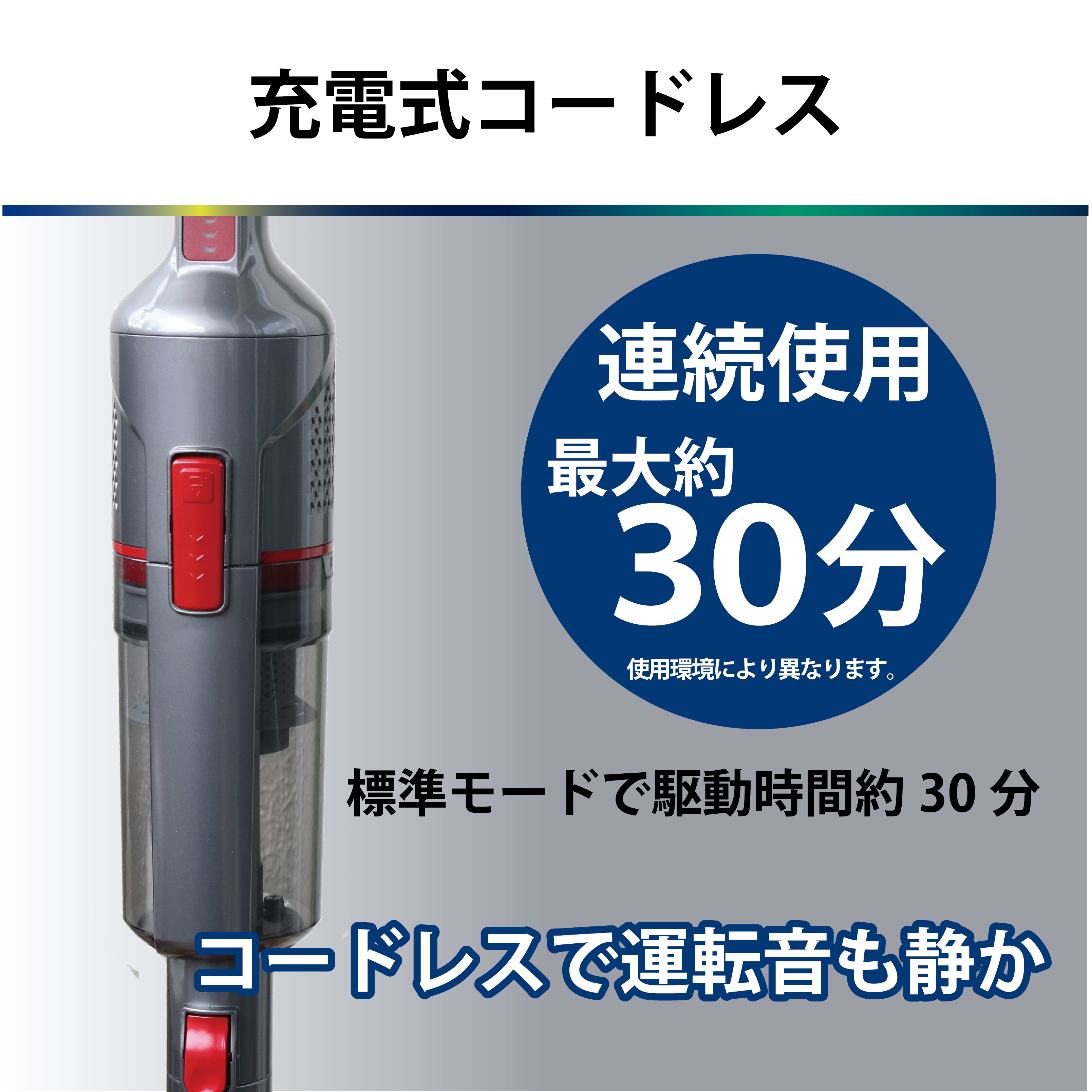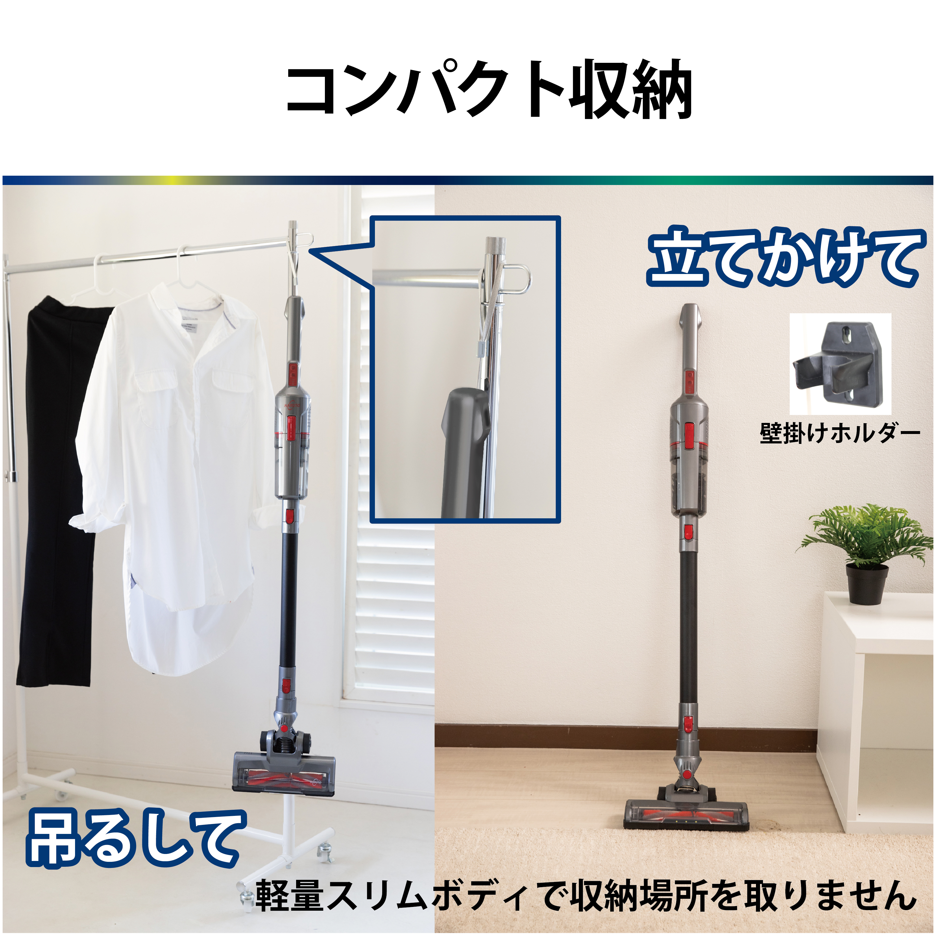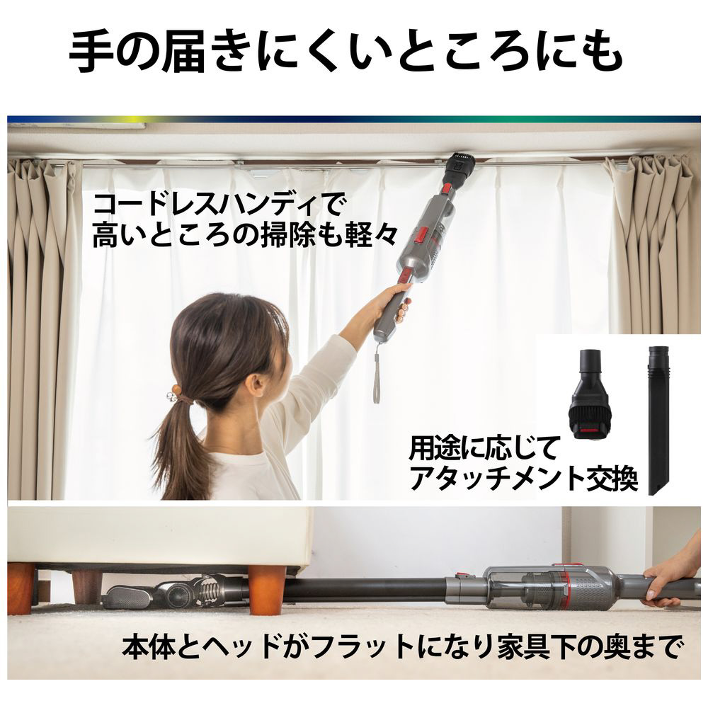 ・200W高効率ブラシレスモーターを使用、高い吸引力を実現 ・LEDライト付きパワーヘッド ・バッテリー残量 3段階表示 ・スティック&ハンディ―の2Way仕様
