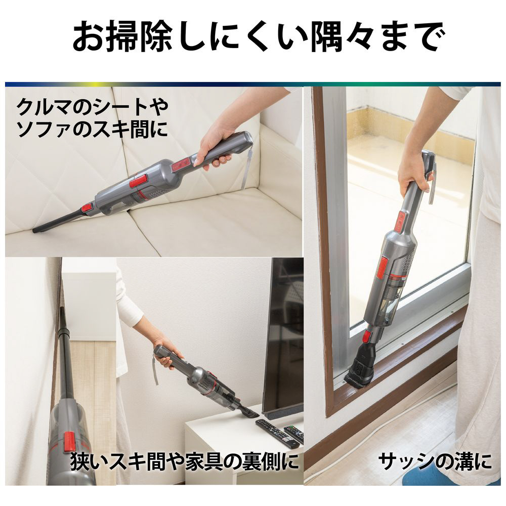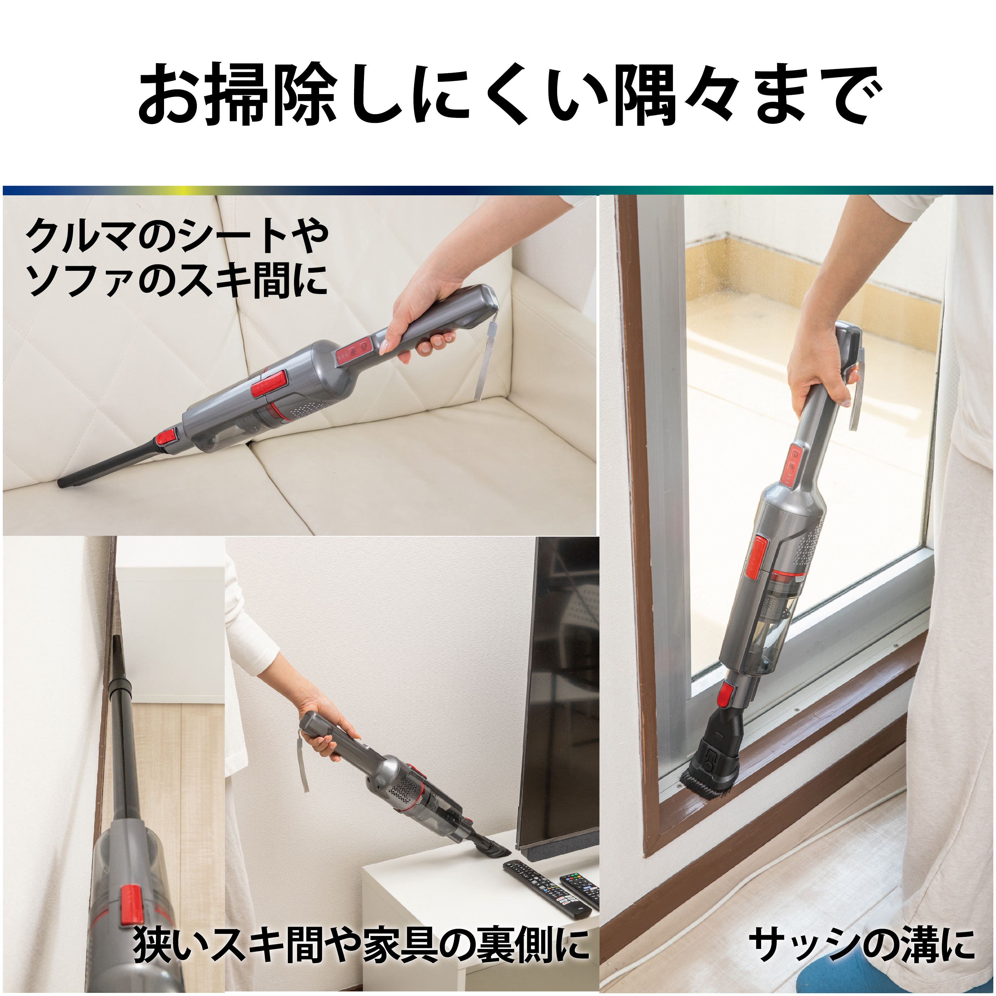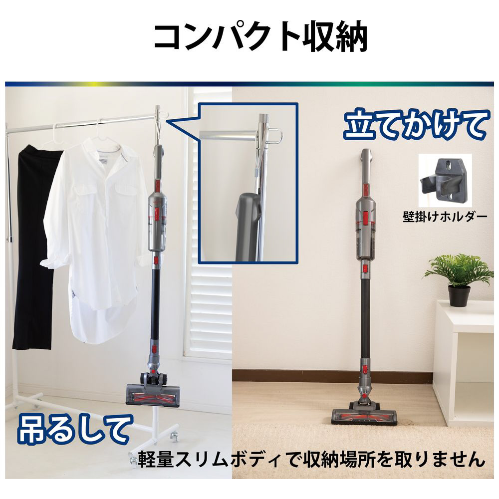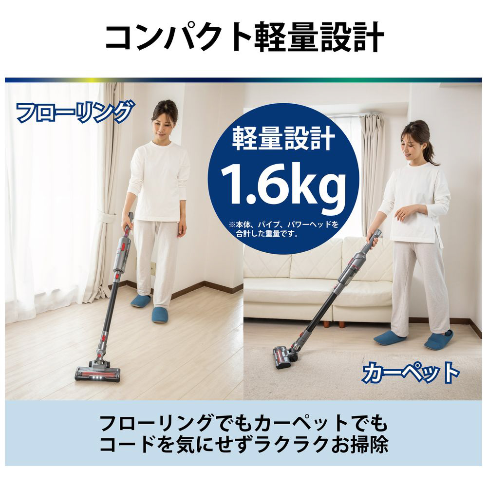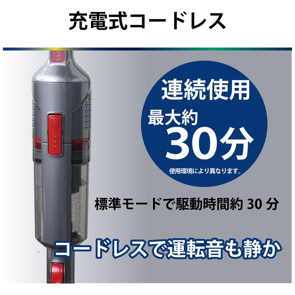・200W高効率ブラシレスモーターを使用、高い吸引力を実現 ・LEDライト付きパワーヘッド ・バッテリー残量 3段階表示 ・スティック&ハンディ―の2Way仕様