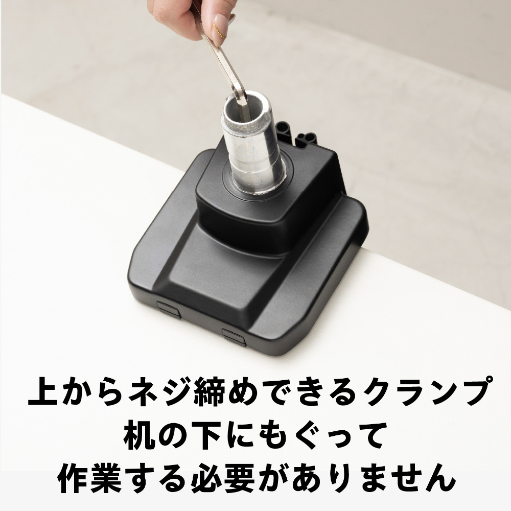 クランプ固定とグロメット固定の二種類の固定方法に対応。机にしっかり固定することで液晶ディスプレイの転倒を防止