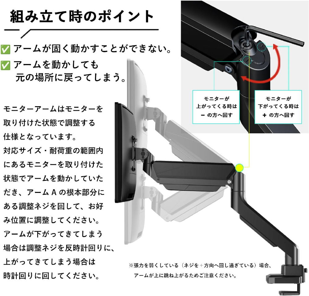 3関節のガススプリング式アームにより、動画鑑賞や事務作業、ゲームなど様々な用途に合わせながら、自由自在にモニターの角度や高さを調整できます。力を入れずに軽く触れるだけで簡単に調整ができるので、ストレスなくご利用いただけます。