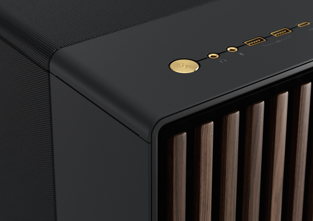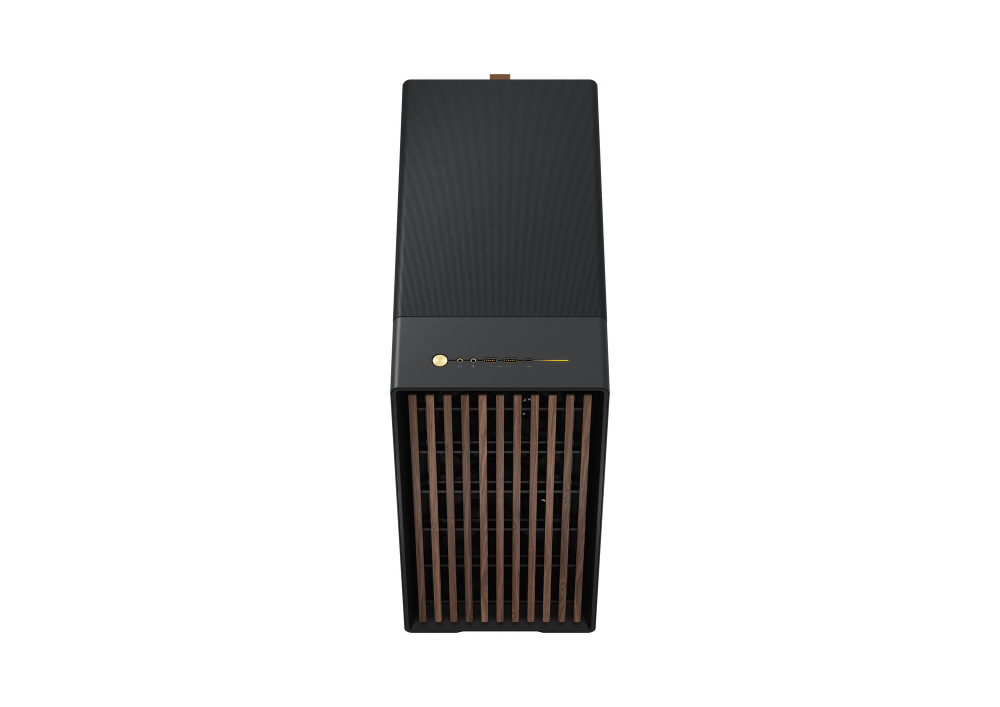 木材を使った洗練されたフロントデザイン。高いエアフローを実現するフルタワー型PCケース