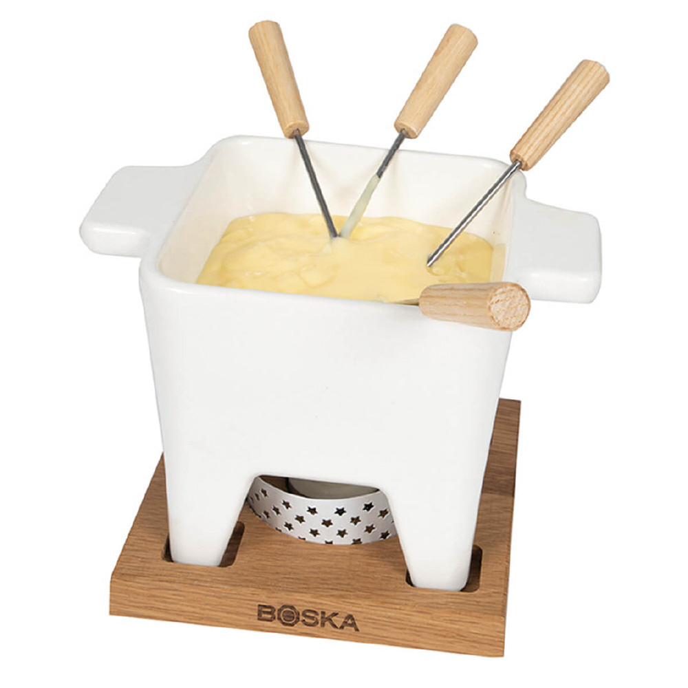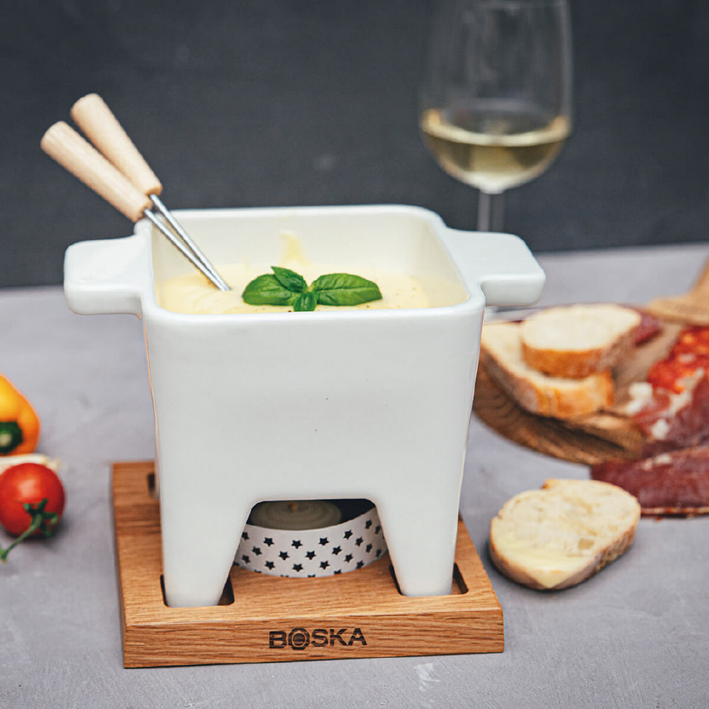 このスタイリッシュなセットには、600 mlの容量のフォンデュポットが付属しており、350グラムの美味しいチーズフォンデュを楽しむスペースがあります。これは2人分のディナーや4人分の美味しいスナックに十分な量です。また、例えばバーベキューの際にソースを400 ml温かく保つこともできます。