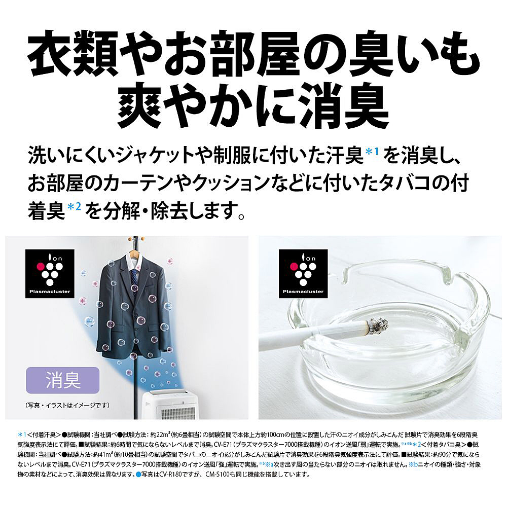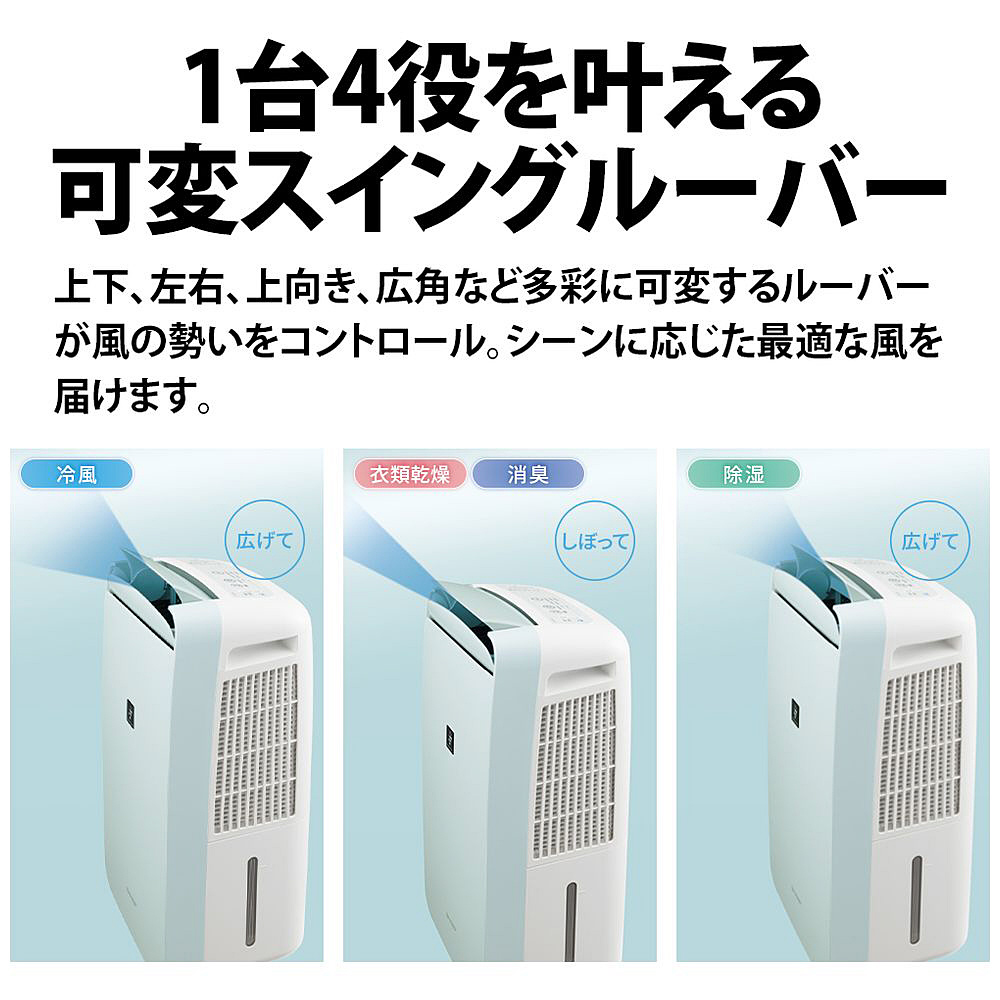 「冷風」「衣類乾燥」「除湿」「消臭」の、1台4役。「コンパクトクール」で、パーソナルスペースを涼しく快適に。