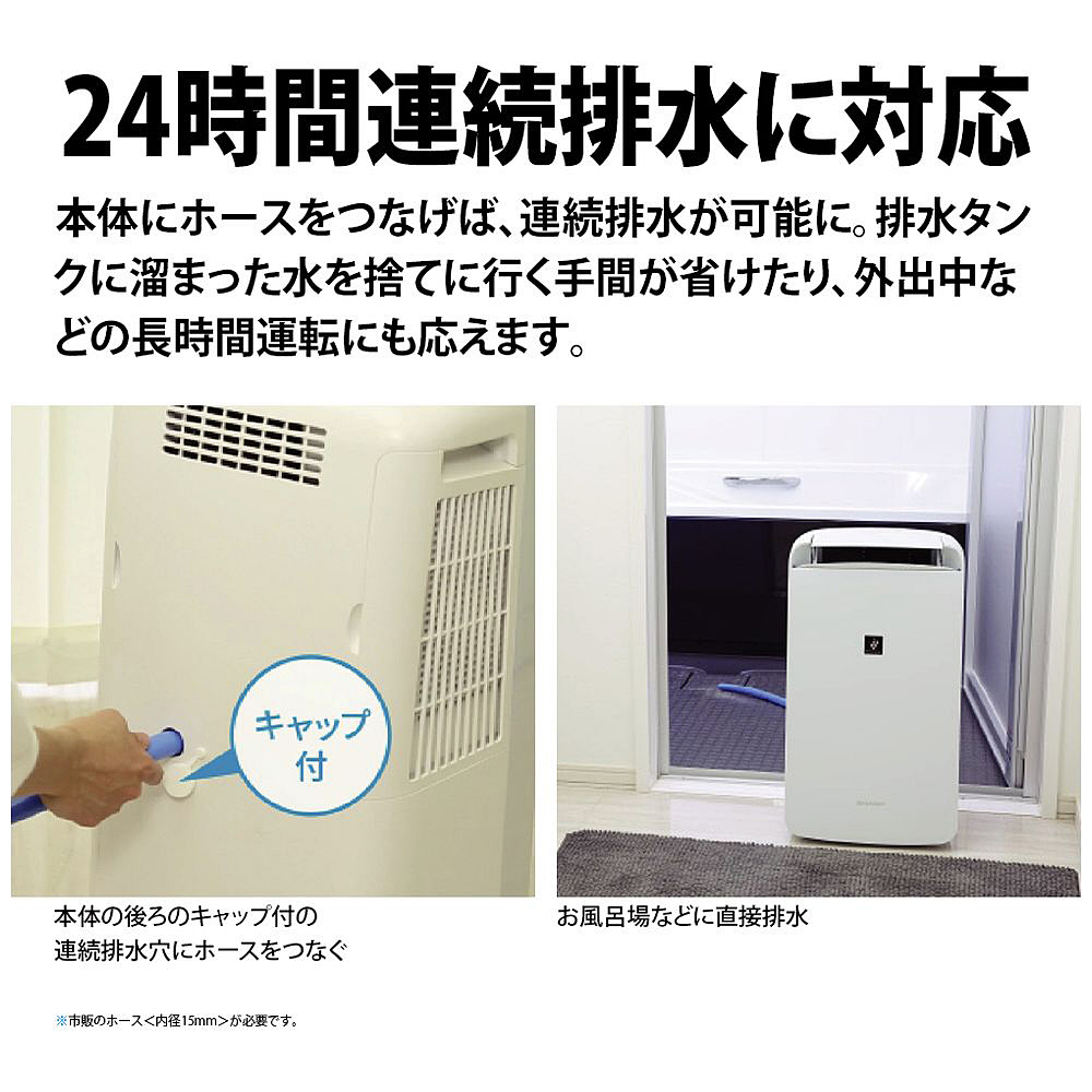 本体をホースにつなげば、連続排水が可能に。排水タンクに溜まった水を捨てに行く手間が省けたり、外出中などの長時間運転にも応えます。
