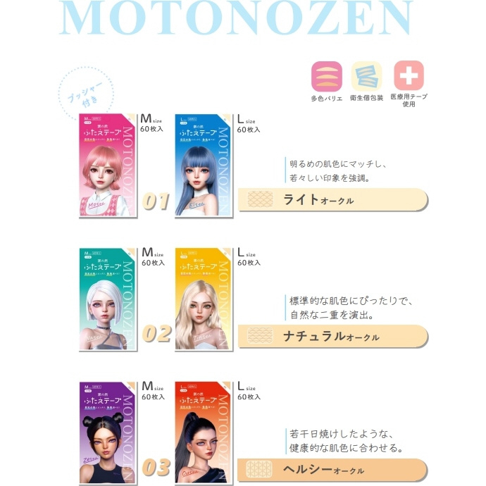 M、L の2サイズを展開、肌に密着、理想的な二重に演出することができます。医療用テープ使用と衛生的な個包装で安全性に配慮しました。外出や持ち歩きにもとても便利です。