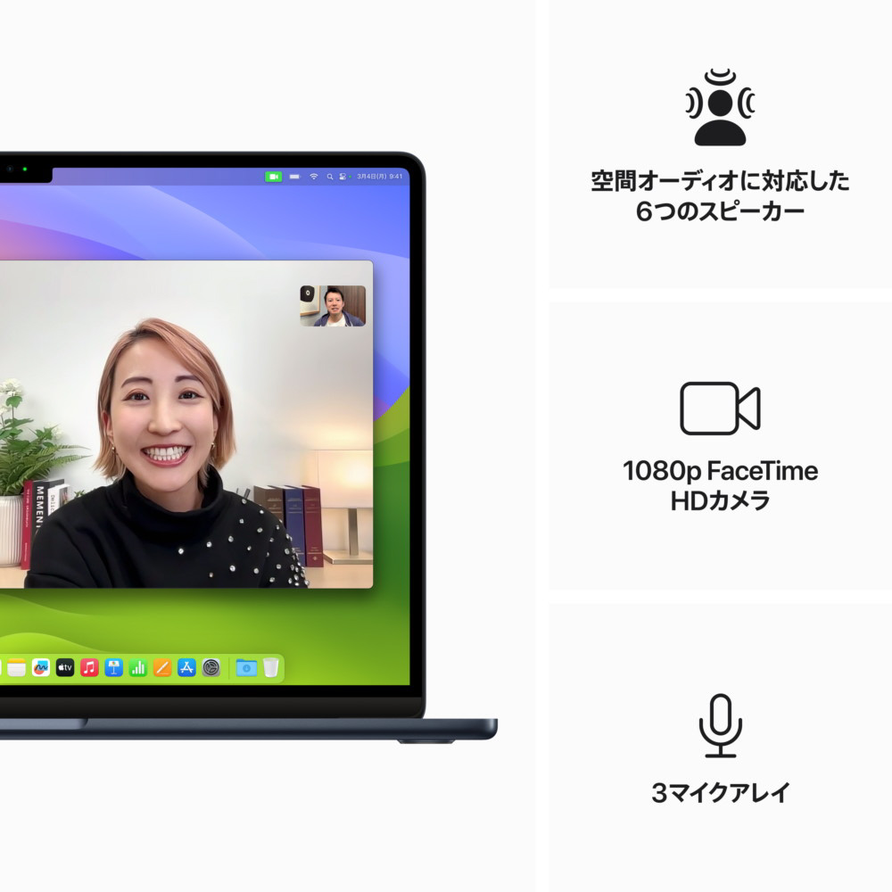 15インチMacBook Air。パワーがとまらない。M3チップにより、15インチMacBook Airが一段と優れた性能を持ちました。超ポータブルなボディなのに、最大18時間使えるバッテリーを内蔵。仕事も遊びも、好きな場所で好きなように楽しめます。