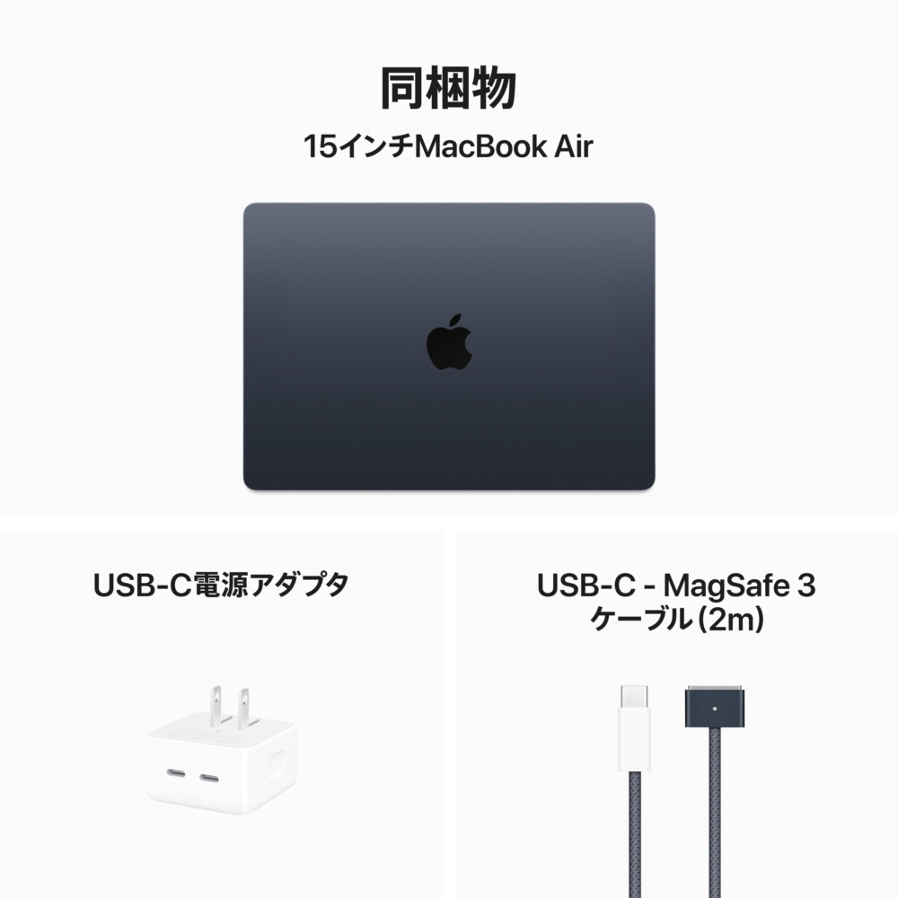 15インチMacBook Air: 8コアCPUと10コアGPUを搭載したApple M3チップ, 8GB, 512GB SSD ‐ ミッドナイト MRYV3J/A