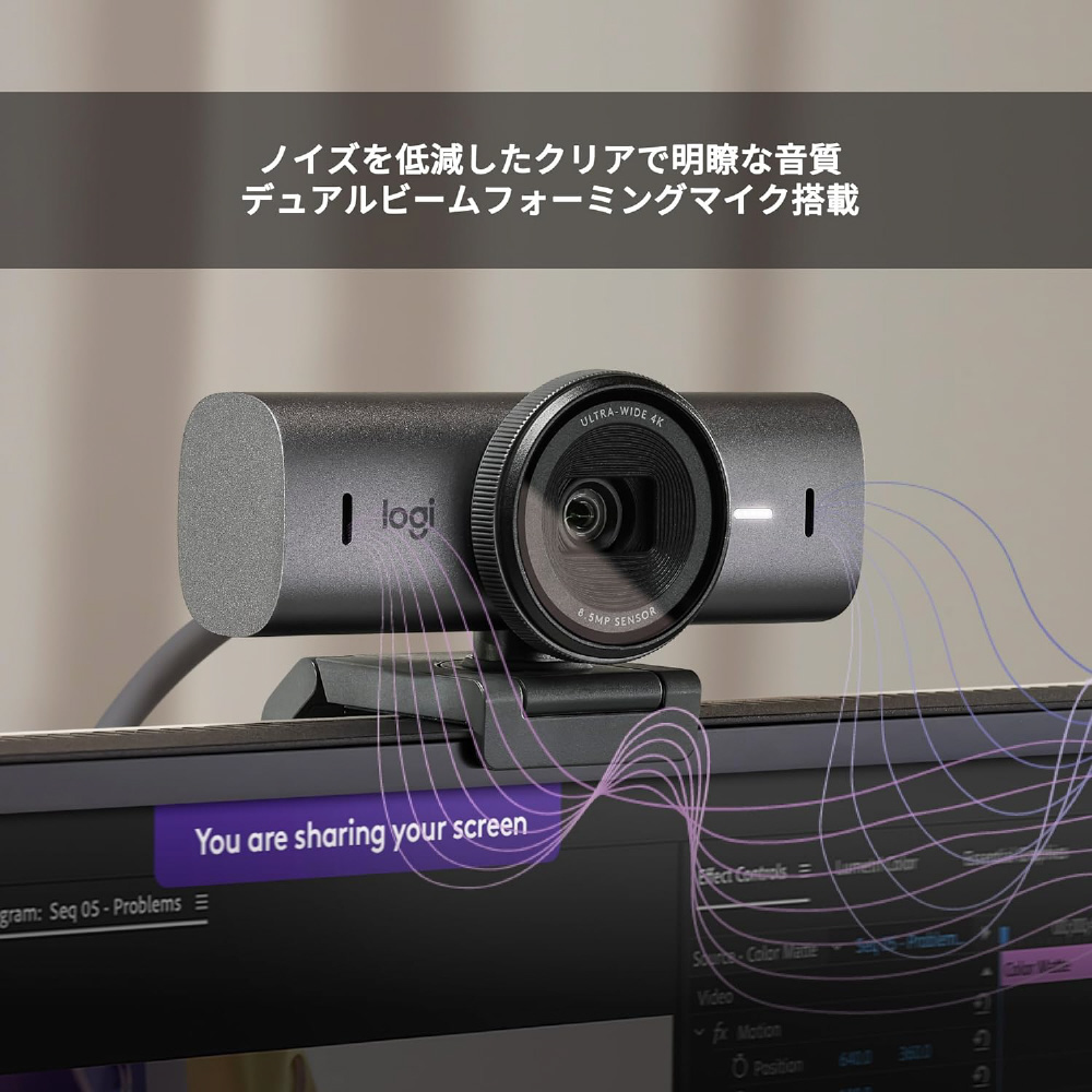 ロジクールのウェブカメラで最大の新センサーと独自設計のレンズを搭載し、4K対応の高画質に加え、どのような照明下でも自然な美しさを映し出します。さらに、3Dノイズリダクションによりノイズを軽減し映像をよりシャープにします。また、人物を瞬時かつ正確に画面の中心にとらえるオートフォーカス機能も搭載しています。
